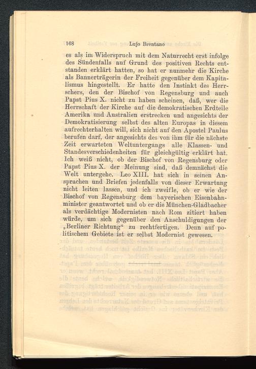 es als im Widerspruch mit dem Naturrecht erst infolgedes Sündenfalls auf Grund des positiven Rechts ent-standen erklärt hatten, so hat er nunmehr die Kircheals Bannerträgerin der Freiheit gegenüber dem Kapita-lismus hingestellt. Er hatte den Instinkt des Herr-schers, den der Bischof von Regenshurg und auchPapst Pius X . nicht zu haben scheinen, daß, wer dieHerrschaft der Kirche auf die demokratischen ErdteileAmerika und Australien erstrecken und angesichts derDemokratisierung selbst des alten Europas in diesemaufrechterhalten will, sich nicht auf den Apostel Paulus berufen darf, der angesichts des von ihm für die nächsteZeit erwarteten Weltuntergangs alle Klassen- undStandesverschiedenheiten für gleichgültig erklärt hat.Ich weiß nicht, ob der Bischof von Regensburg oderPapst Pius X. der Meinung sind, daß demnächst dieWelt untergehe. Leo XIII . hat sich in seinen An-sprachen und Briefen jedenfalls von dieser Erwartungnicht leiten lassen, und ich zweifle, ob er wie derBischof von Regensburg dem bayerischen Eisenbahn-minister geantwortet und ob er die Miinchen-Gladbacherals verdächtige Modernisten nach Rom zitiert habenwürde, um sich gegenüber den Anschuldigungen der„Berliner Richtung“ zu rechtfertigen. Denn auf po-litischem Gebiete ist er selbst Modernist gewesen.