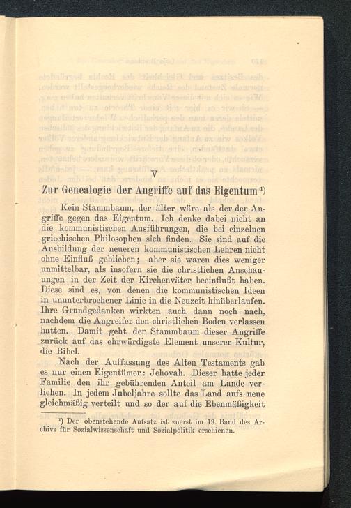 Kein Stammbaum, der älter wäre als der der An-griffe gegen das Eigentum. Ich denke dabei nicht andie kommunistischen Ausführungen, die hei einzelnengriechischen Philosophen sich finden. Sie sind auf dieAusbildung der neueren kommunistischen Lehren nichtohne Einfluß gehliehen; aber sie waren dies wenigerunmittelbar, als insofern sie die christlichen Anschau-ungen in der Zeit der Kirchenväter beeinflußt haben.Liese sind es, von denen die kommunistischen Ideenin ununterbrochener Linie in die Neuzeit hinüberlaufen.Ihre Grundgedanken wirkten auch dann noch nach,nachdem die Angreifer den christlichen Boden verlassenhatten. Damit geht der Stammbaum dieser Angriffezurück auf das ehrwürdigste Element unserer Kultur,die Bibel.