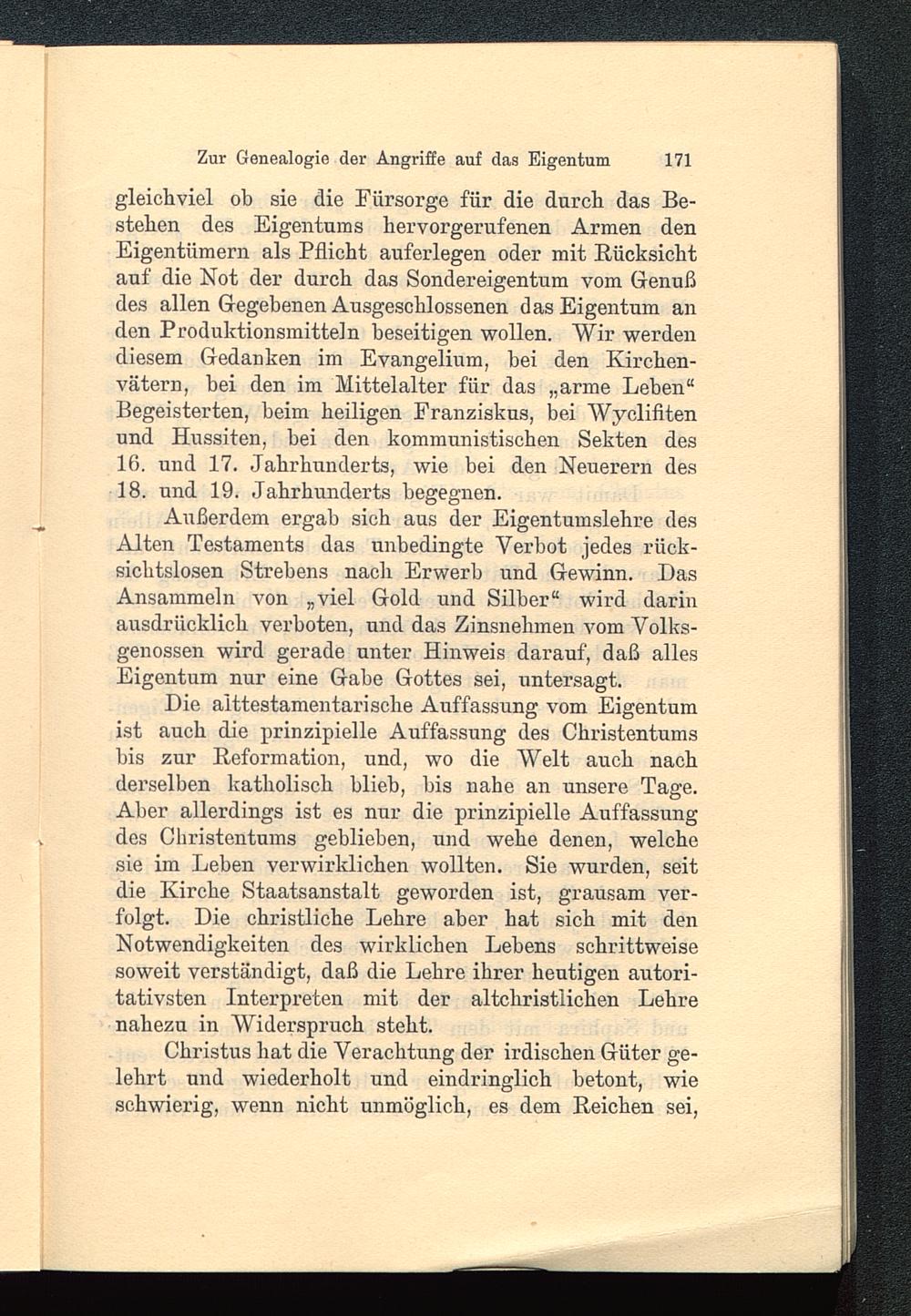 gleichviel oh sie die Fürsorge für die durch das Be-stehen des Eigentums hervorgerufenen Armen denEigentümern als Pflicht auferlegen oder mit Rücksichtauf die Not der durch das Sondereigentum vom Genußdes allen Gegebenen Ausgeschlossenen das Eigentum anden Produktionsmitteln beseitigen wollen. Wir werdendiesem Gedanken im Evangelium, bei den Kirchen-vätern, bei den im Mittelalter für das „arme Lehen“Begeisterten, beim heiligen Franziskus, bei Wyclifitenund Hussiten, hei den kommunistischen Sekten des16. und 17. Jahrhunderts, wie bei den Neuerern des18. und 19. Jahrhunderts begegnen.