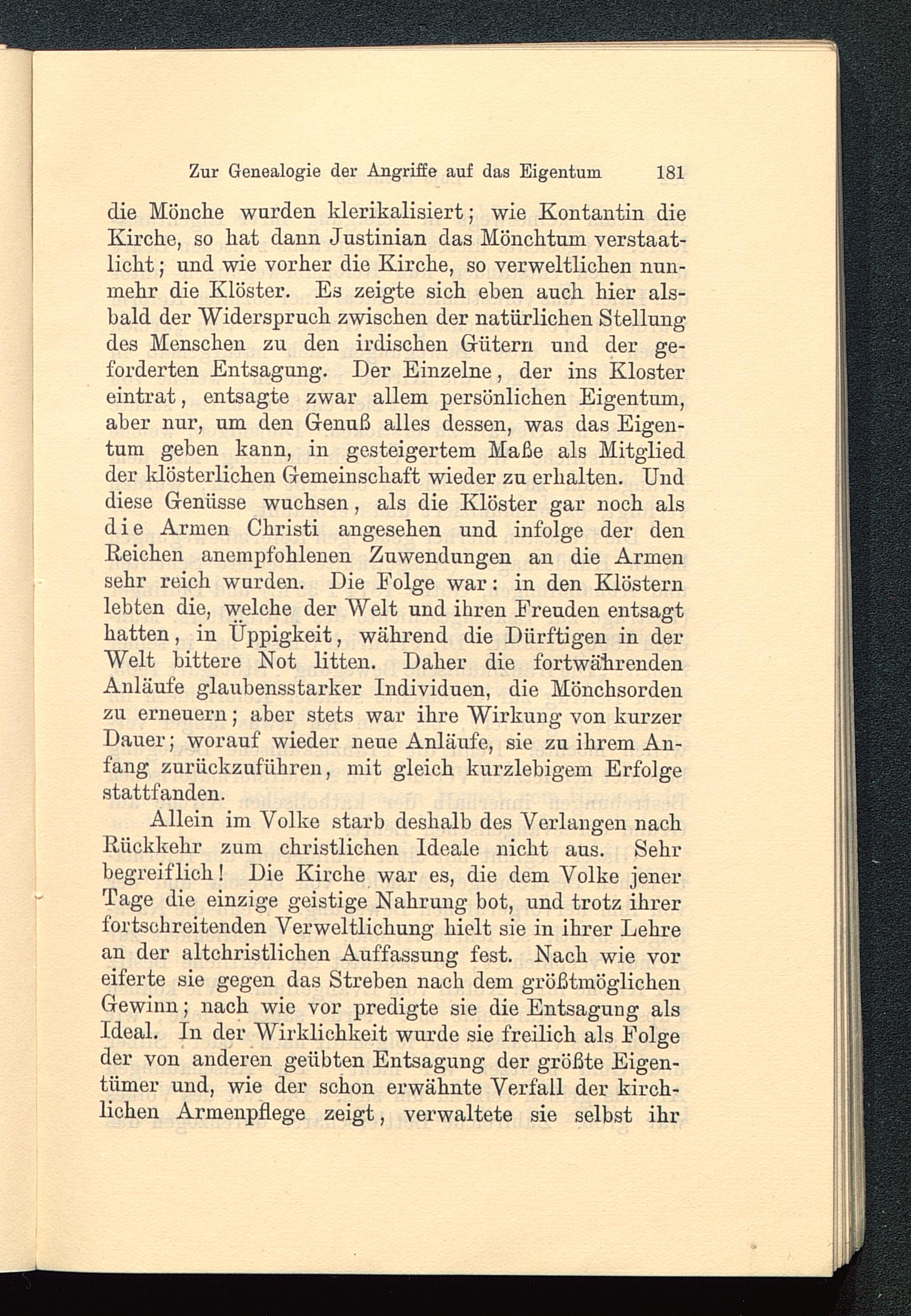 die Mönche wurden klerikalisiert; wie Kontantin dieKirche, so hat dann Justinian das Mönchtum verstaat-licht ; und wie vorher die Kirche, so verweltlichen nun-mehr die Klöster. Es zeigte sich eben auch hier als-bald der Widerspruch zwischen der natürlichen Stellungdes Menschen zu den irdischen Gütern und der ge-forderten Entsagung. Der Einzelne, der ins Klostereintrat, entsagte zwar allem persönlichen Eigentum,aber nur, um den Genuß alles dessen, was das Eigen-tum geben kann, in gesteigertem Maße als Mitgliedder klösterlichen Gemeinschaft wieder zu erhalten. Unddiese Genüsse wuchsen, als die Klöster gar noch alsdie Armen Christi angesehen und infolge der denReichen anempfohlenen Zuwendungen an die Armensehr reich wurden. Die Eolge war: in den Klösternlebten die, welche der Welt und ihren Freuden entsagthatten, in Üppigkeit, während die Dürftigen in derWelt bittere Not litten. Daher die fortwährendenAnläufe glaubensstarker Individuen, die Mönchsordenzu erneuern; aber stets war ihre Wirkung von kurzerDauer; worauf wieder neue Anläufe, sie zu ihrem An-fang zurückzuführen, mit gleich kurzlebigem Erfolgestattfanden.