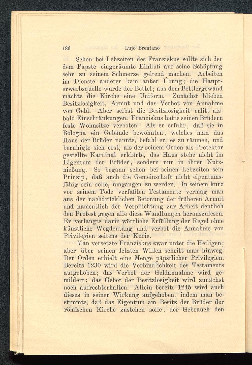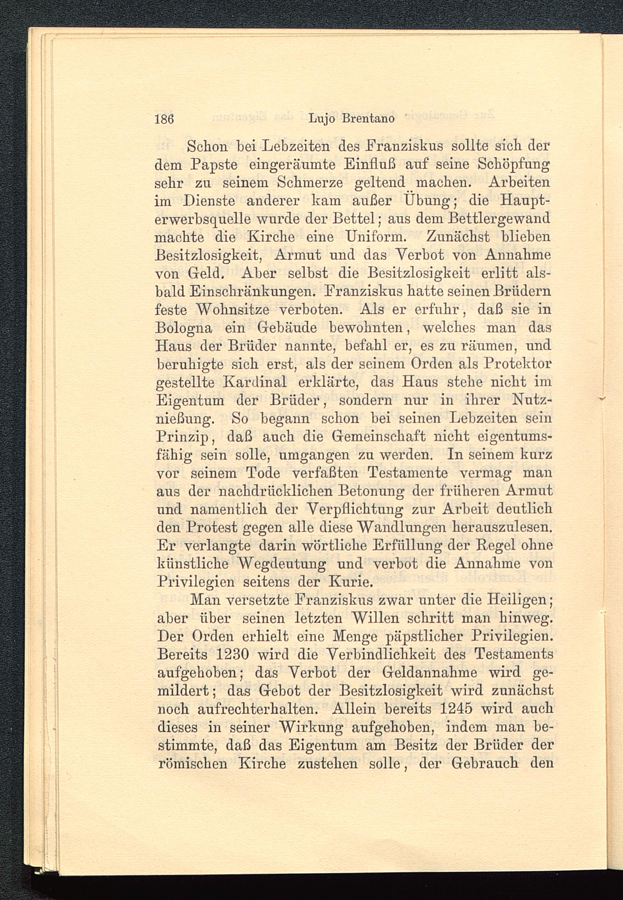 Schon hei Lebzeiten des Franziskus sollte sich derdem Papste eingeräumte Einfluß auf seine Schöpfungsehr zu seinem Schmerze geltend machen. Arbeitenim Dienste anderer kam außer Übung; die Haupt-erwerbsquelle wurde der Bettel; aus dem Bettlergewandmachte die Kirche eine Uniform. Zunächst bliebenBesitzlosigkeit, Armut und das Verbot von Annahmevon Geld. Aber selbst die Besitzlosigkeit erlitt als-bald Einschränkungen. Franziskus hatte seinen Brüdernfeste Wohnsitze verboten. Als er erfuhr, daß sie inBologna ein Gebäude bewohnten, welches man dasHaus der Brüder nannte, befahl er, es zu räumen, undberuhigte sich erst, als der seinem Orden als Protektorgestellte Kardinal erklärte, das Haus stehe nicht imEigentum der Brüder, sondern nur in ihrer Nutz-nießung. So begann schon bei seinen Lebzeiten seinPrinzip, daß auch die Gemeinschaft nicht eigentums-fähig sein solle, umgangen zu werden. In seinem kurzvor seinem Tode verfaßten Testamente vermag manaus der nachdrücklichen Betonung der früheren Armutund namentlich der Verpflichtung zur Arbeit deutlichden Protest gegen alle diese Wandlungen herauszulesen.Er verlangte darin wörtliche Erfüllung der Regel ohnekünstliche Wegdeutung und verbot die Annahme vonPrivilegien seitens der Kurie.