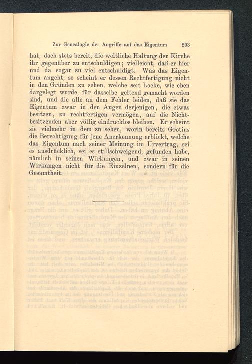 hat, doch stets bereit, die weltliche Haltung der Kircheihr gegenüber zu entschuldigen; vielleicht, daß er hierund da sogar zu viel entschuldigt. Was das Eigen-tum angeht, so scheint er dessen Hechtfertigung nichtin den Gründen zu sehen, welche seit Locke, wie ebendargelegt wurde, für dasselbe geltend gemacht wordensind, und die alle an dem Fehler leiden, daß sie dasEigentum zwar in den Augen derjenigen, die etwasbesitzen, zu rechtfertigen vermögen, auf die Nicht-besitzenden aber völlig eindrucldos bleiben. Er scheintsie vielmehr in dem zu sehen, worin bereits ffrotiusdie Berechtigung für jene Anerkennung erblickt, welchedas Eigentum nach seiner Meinung im Urvertrag, seies ausdrücklich, sei es stillschweigend, gefunden habe,nämlich in seinen Wirkungen, und zwar in seinenWirkungen nicht für die Einzelnen, sondern für dieGesamtheit.