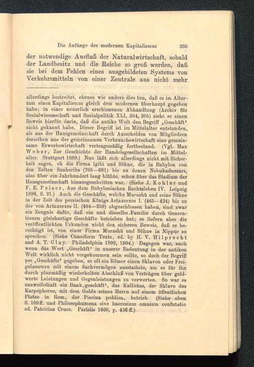allerdings bestreitet, ebenso wie andere dies tun, daß es im Alter-tum einen Kapitalismus gleich dem modernen überhaupt gegebenhabe; in einer neuerlich erschienenen Abhandlung (Archiv fürSozialwissenschaft und Sozialpolitik XLT, 304, 305) sieht er einenBeweis hierfür darin, daß die antike Welt den Begriff „Geschäft“nicht gekannt habe. Dieser Begriff ist im Mittelalter entstanden,als aus der Hausgemeinschaft durch Ausscheiden von Mitgliedernderselben aus der gemeinsamen Verbrauchswirtschaft eine gemein-same Erwerbswirtschaft vertragsmäßig fortbestand. (Vgl. MaxWeber , Zur Geschichte der Handelsgesellschaften im Mittel-alter. Stuttgart 1889.) Nun läßt sich allerdings nicht mit Sicher-heit sagen, ob die Firma Igibi und Söhne, die in Babylon vonden Zelten Sanheribs (705—681) bis zu denen Nebukadnezars,also über ein Jahrhundert lang blühte, schon über das Stadium derHausgemeinschaft hinausgeschritten war. (Siehe J. Köhler undF. E. P e i s e r , Aus dem Babylonischen Rechtsleben IV. Leipzig1898, S. 21.) Auch die Geschäfte, welche Murashü und seine Söhnein der Zeit des persischen Königs Artaxerxes I. ( 465—424) bis zuder von Artaxerxes II. ( 404—359) abgeschlossen haben, sind zwarein Zeugnis dafür, daß ein und dieselbe .Familie durch Genera-tionen gleichartige Geschäfte betrieben hat; es liefern aber dieveröffentlichten Urkunden nicht den sicheren Beweis, daß es be-rechtigt ist, von einer Firma Murashü und Söhne in Nippur zusprechen. (Siehe Cuneiform Texts, ed. by H. V. H i 1 p r e c h tand A. T. Clay. Philadelphia 1898, 1904.) Dagegen war, auchwenn das Wort „Geschäft“ in unserer Bedeutung in der antikenWelt wirklich nicht vorgekommen sein sollte, so doch der Begriffpes „Geschäfts“ gegeben, so oft ein Römer einen Sklaven oder Frei-gelassenen mit einem Sachvermögen ausstattete, um e3 für ihndurch planmäßig wiederholten Abschluß von Verträgen über geld-werte Leistungen und Gegenleistungen zu verwerten. So war esunzweifelhaft ein Bankgeschäft“, das Kallistus, der Sklave desKarpophorus, mit dem Gelde seines Herrn auf einem öffentlichenPlatze in Rom, der Piscina publica, betrieb. (Siehe obenS. 109ff. und Philosophumena sive haeresium omnium confutatioed. Patricius Cruce. Parisiis 1860, p. 436-ff.)