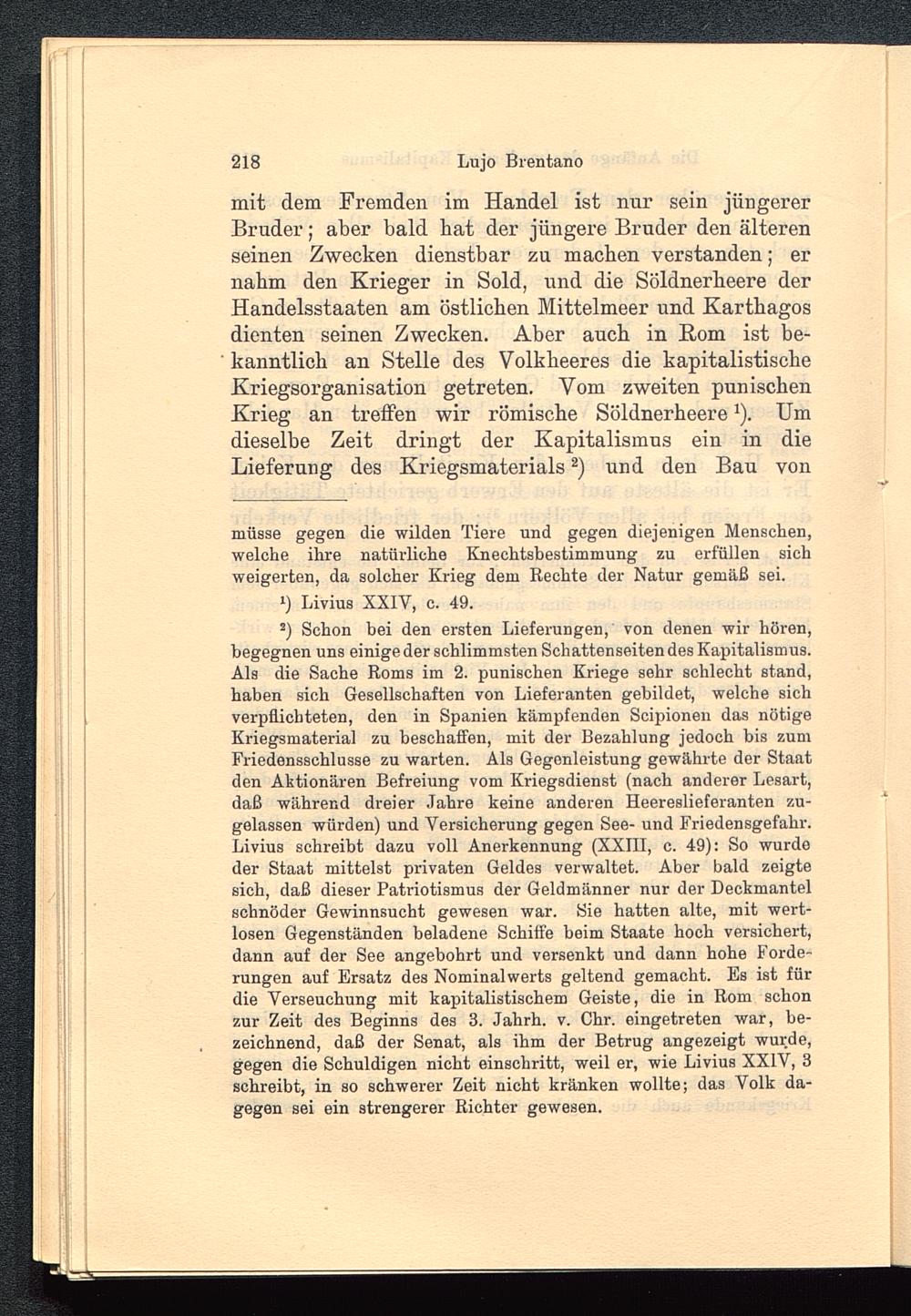 J ) Schon bei den ersten Lieferungen, von denen wir hören,begegnen uns einige der schlimmsten Schatten seiten des Kapitalismus.Als die Sache Roms im 2. punischen Kriege sehr schlecht stand,haben sich Gesellschaften von Lieferanten gebildet, welche sichverpflichteten, den in Spanien kämpfenden Scipionen das nötigeKriegsmaterial zu beschaffen, mit der Bezahlung jedoch bis zumFriedensschlüsse zu warten. Als Gegenleistung gewährte der Staatden Aktionären Befreiung vom Kriegsdienst (nach anderer Lesart,daß während dreier Jahre keine anderen Heereslieferanten zu-gelassen würden) und Versicherung gegen See- und Friedensgefahr.Livius schreibt dazu voll Anerkennung (XXIII, c. 49): So wurdeder Staat mittelst privaten Geldes verwaltet. Aber bald zeigtesich, daß dieser Patriotismus der Geldmänner nur der Deckmantelschnöder Gewinnsucht gewesen war. Sie hatten alte, mit wert-losen Gegenständen beladene Schiffe beim Staate hoch versichert,dann auf der See angebohrt und versenkt und dann hohe Forde-rungen auf Ersatz des Nominalwerts geltend gemacht. Es ist fürdie Verseuchung mit kapitalistischem Geiste, die in Rom schonzur Zeit des Beginns des 3. Jahrh. v. Chr. eingetreten war, be-zeichnend, daß der Senat, als ihm der Betrug angezeigt wurde,gegen die Schuldigen nicht einschritt, weil er, wie Livius XXIV, 3schreibt, in so schwerer Zeit nicht kränken wollte; das Volk da-gegen sei ein strengerer Richter gewesen.