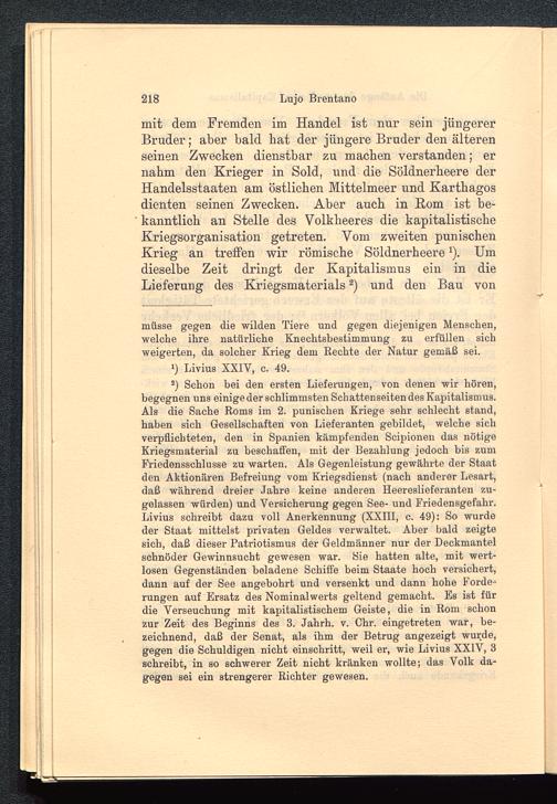 mit dem Fremden im Handel ist nur sein jüngererBruder; aber bald hat der jüngere Bruder den älterenseinen Zwecken dienstbar zu machen verstanden; ernahm den Krieger in Sold, und die Söldnerheere derHandelsstaaten am östlichen Mittelmeer und Karthagosdienten seinen Zwecken. Aber auch in Rom ist be-kanntlich an Stelle des Volkheeres die kapitalistischeKriegsorganisation getreten. Vom zweiten punischenKrieg an treffen wir römische Söldnerheere ! ). Umdieselbe Zeit dringt der Kapitalismus ein in dieLieferung des Kriegsmaterials 2 ) und den Bau von