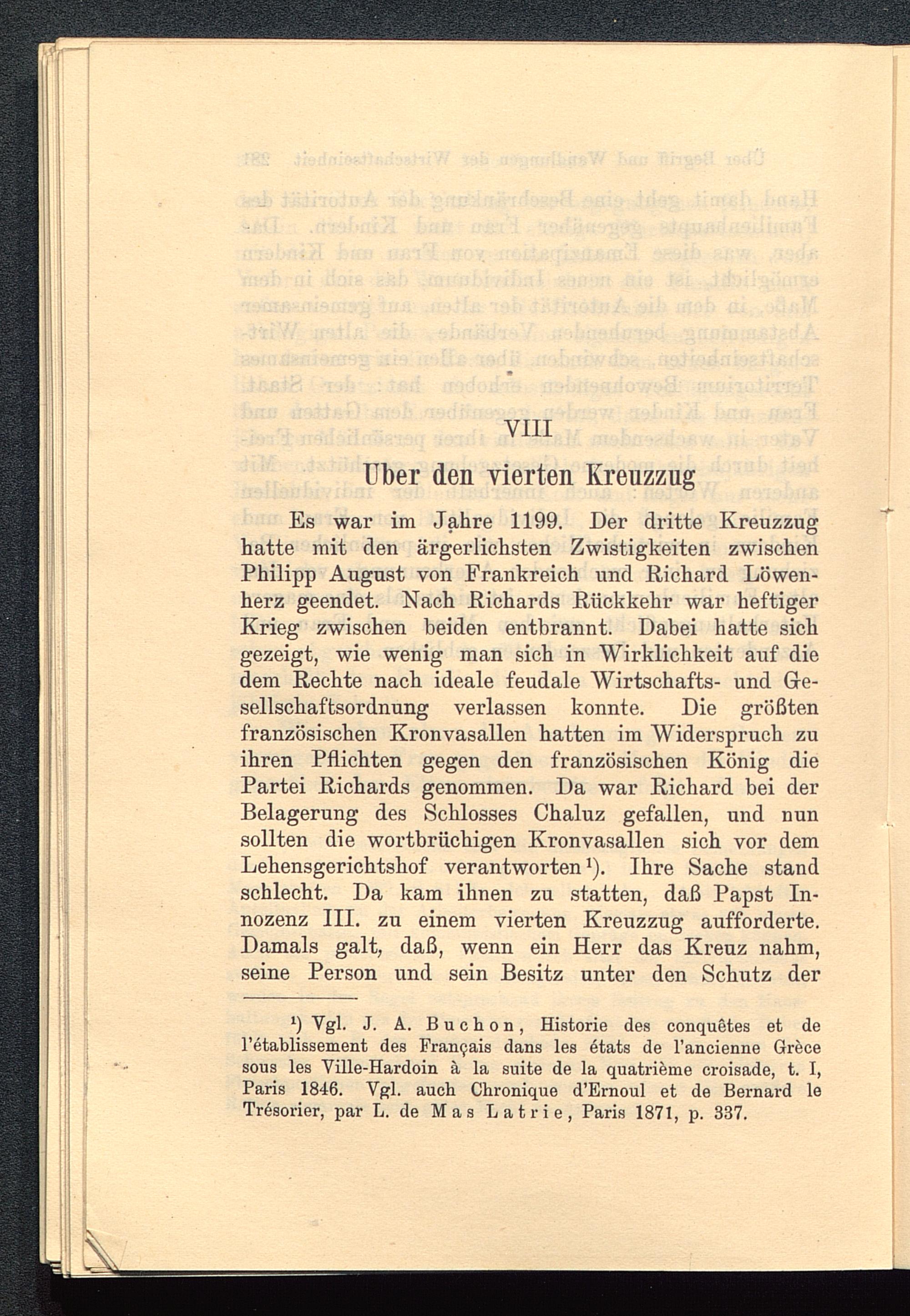 Es war im Jahre 1199. Der dritte Kreuzzughatte mit den ärgerlichsten Zwistigkeiten zwischenPhilipp August von Frankreich und Richard Löwen-herz geendet. Nach Richards Rückkehr war heftigerKrieg zwischen beiden entbrannt. Dabei hatte sichgezeigt, wie wenig man sich in Wirklichkeit auf diedem Rechte nach ideale feudale Wirtschafts- und Ge-sellschaftsordnung verlassen konnte. Die größtenfranzösischen Kronvasallen hatten im Widerspruch zuihren Pflichten gegen den französischen König diePartei Richards genommen. Da war Richard bei derBelagerung des Schlosses Chaluz gefallen, und nunsollten die wortbrüchigen Kronvasallen sich vor demLehensgerichtshof verantworten 1 ). Ihre Sache standschlecht. Da kam ihnen zu statten, daß Papst In-nozenz III. zu einem vierten Kreuzzug aufforderte.Damals galt, daß, wenn ein Herr das Kreuz nahm,seine Person und sein Besitz unter den Schutz der