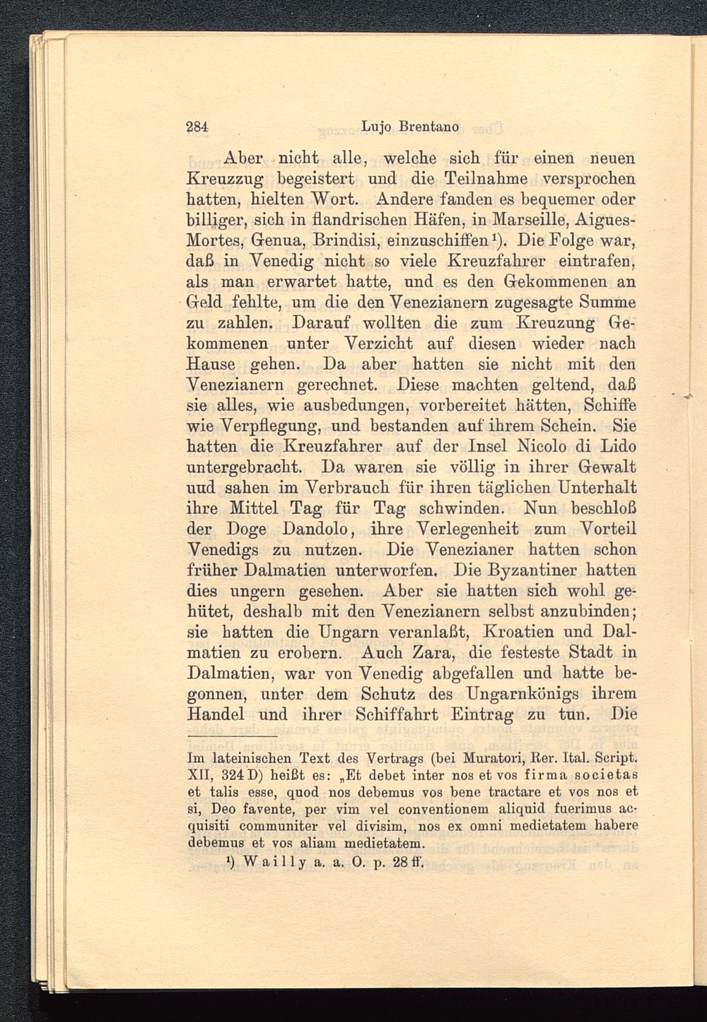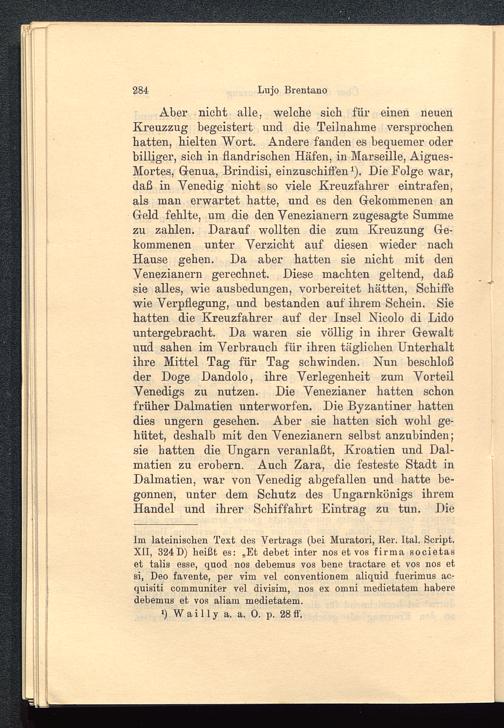 Aber nicht alle, welche sich für einen neuenKreuzzug begeistert und die Teilnahme versprochenhatten, hielten Wort. Andere fanden es bequemer oderbilliger, sich in flandrischen Häfen, in Marseille, Aigues-Mortes, Genua, Brindisi , einzuschiffen 1 ). Die Folge war,daß in Venedig nicht so viele Kreuzfahrer eintrafen,als man erwartet hatte, und es den Gekommenen anGeld fehlte, um die den Venezianern zugesagte Summezu zahlen. Darauf wollten die zum Kreuzung Ge-kommenen unter Verzicht auf diesen wieder nachHause gehen. Da aber hatten sie nicht mit denVenezianern gerechnet. Diese machten geltend, daßsie alles, wie ausbedungen, vorbereitet hätten, Schiffewie Verpflegung, und bestanden auf ihrem Schein. Siehatten die Kreuzfahrer auf der Insel Nicolo di Lidountergebracht. Da waren sie völlig in ihrer Gewaltuud sahen im Verbrauch für ihren täglichen Unterhaltihre Mittel Tag für Tag schwinden. Nun beschloßder Doge Dandolo , ihre Verlegenheit zum VorteilVenedigs zu nutzen. Die Venezianer hatten schonfrüher Dalmatien unterworfen. Die Byzantiner hattendies ungern gesehen. Aber sie hatten sich wohl ge-hütet, deshalb mit den Venezianern selbst anzubinden;sie hatten die Ungarn veranlaßt, Kroatien und Dal-matien zu erobern. Auch Zara , die festeste Stadt inDalmatien , war von Venedig abgefallen und hatte be-gonnen, unter dem Schutz des Ungarnkönigs ihremHandel und ihrer Schiffahrt Eintrag zu tun. Die