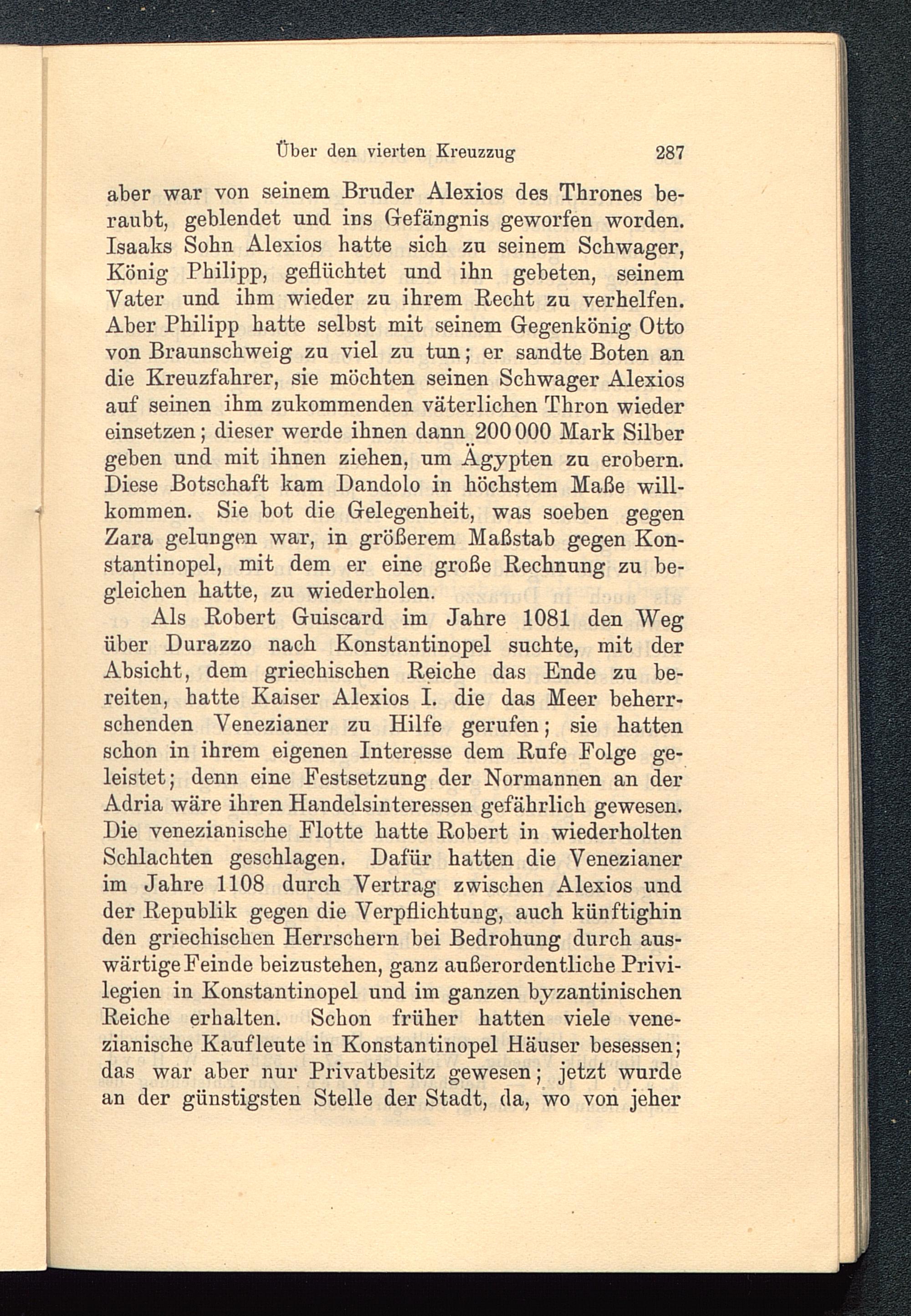 aber war von seinem Bruder Alexios des Thrones be-raubt, geblendet und ins Gefängnis geworfen worden.Isaaks Sohn Alexios hatte sich zu seinem Schwager,König Philipp, geflüchtet und ihn gebeten, seinemVater und ihm wieder zu ihrem Hecht zu verhelfen.Aber Philipp hatte selbst mit seinem Gegenkönig Ottovon Braunschweig zu viel zu tun; er sandte Boten andie Kreuzfahrer, sie möchten seinen Schwager Alexiosauf seinen ihm zukommenden väterlichen Thron wiedereinsetzen; dieser werde ihnen dann 200 000 Mark Silber geben und mit ihnen ziehen, um Ägypten zu erobern.Diese Botschaft kam Dandolo in höchstem Maße will-kommen. Sie bot die Gelegenheit, was soeben gegenZara gelungen war, in größerem Maßstab gegen Kon-stantinopel, mit dem er eine große Rechnung zu be-gleichen hatte, zu wiederholen.