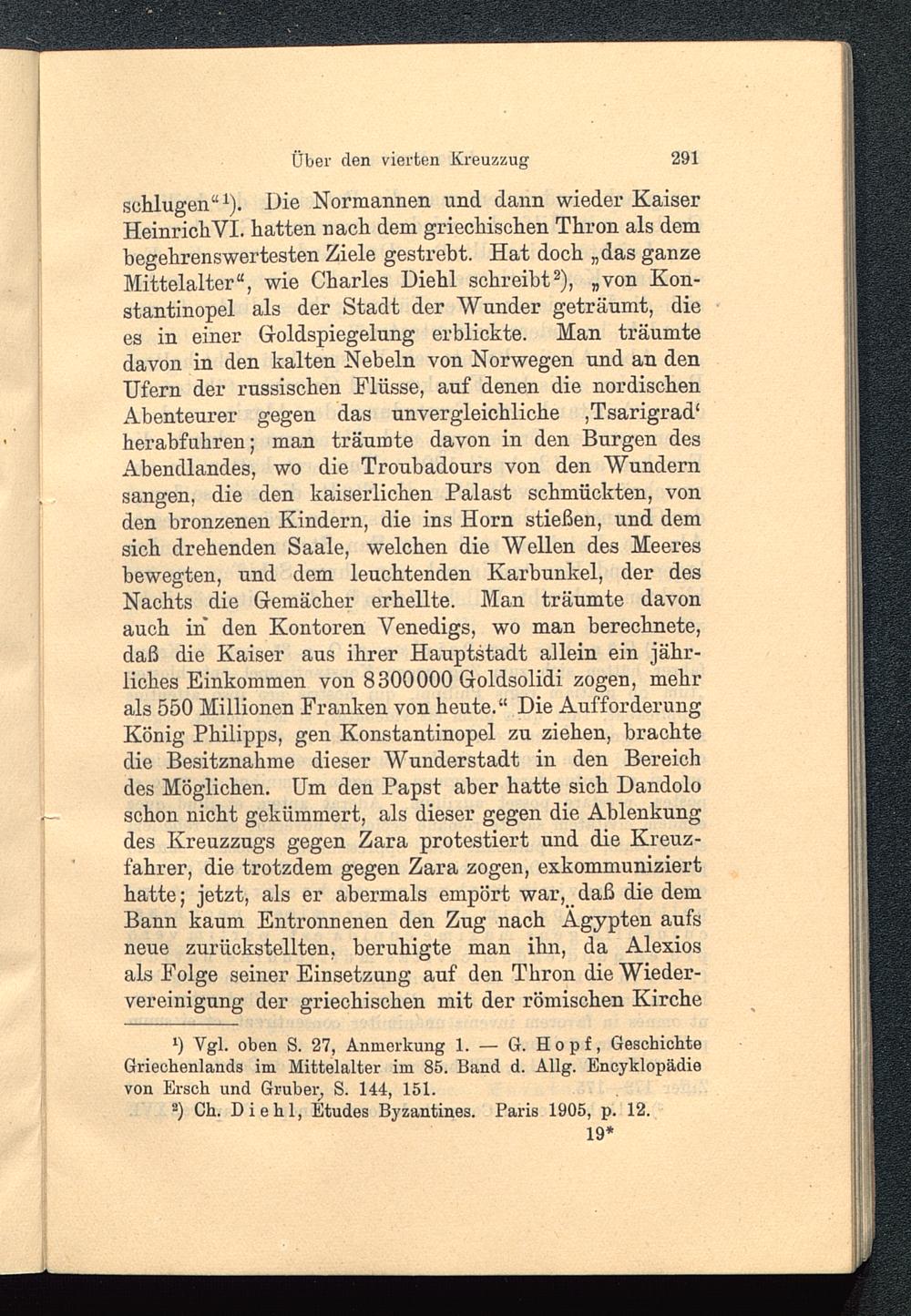 schlugen“ 1 ). Die Normannen und dann wieder KaiserHeinrichVI. hatten nach dem griechischen Thron als dembegehrenswertesten Ziele gestrebt. Hat doch „das ganzeMittelalter“, wie Charles Diehl schreibt 2 ), „von Kon-stantinopel als der Stadt der Wunder geträumt, diees in einer Goldspiegelung erblickte. Man träumtedavon in den kalten Nebeln von Norwegen und an denUfern der russischen Flüsse, auf denen die nordischenAbenteurer gegen das unvergleichliche ,Tsarigrad‘herabfuhren; man träumte davon in den Burgen desAbendlandes, wo die Troubadours von den Wundernsangen, die den kaiserlichen Palast schmückten, vonden bronzenen Kindern, die ins Horn stießen, und demsich drehenden Saale, welchen die Wellen des Meeresbewegten, und dem leuchtenden Karbunkel, der desNachts die Gemächer erhellte. Man träumte davonauch in den Kontoren Venedigs, wo man berechnete,daß die Kaiser aus ihrer Hauptstadt allein ein jähr-liches Einkommen von 8300000 Goldsolidi zogen, mehrals 550 Millionen Franken von heute.“ Die AufforderungKönig Philipps, gen Konstantinopel zu ziehen, brachtedie Besitznahme dieser Wunderstadt in den Bereichdes Möglichen. Um den Papst aber hatte sich Dandolo schon nicht gekümmert, als dieser gegen die Ablenkungdes Kreuzzugs gegen Zara protestiert und die Kreuz-fahrer, die trotzdem gegen Zara zogen, exkommunizierthatte; jetzt, als er abermals empört war, daß die demBann kaum Entronnenen den Zug nach Ägypten aufsneue zurückstellten, beruhigte man ihn, da Alexiosals Folge seiner Einsetzung auf den Thron die Wieder-vereinigung der griechischen mit der römischen Kirche