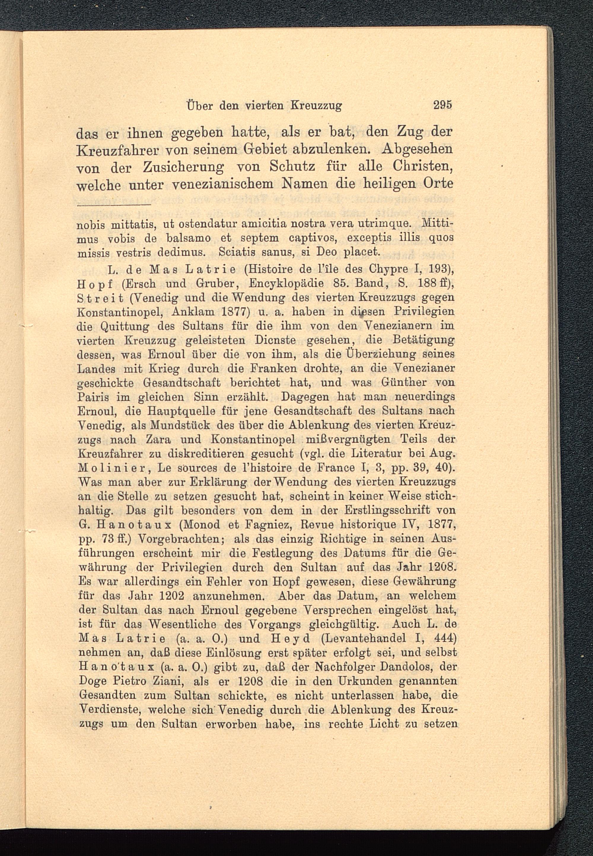 L. de Mas Latrie (Histoire de l’ile des Chypre I, 193),Hopf (Ersch und Gruber, Encyklopädie 85. Band, S. 188 ff),Streit (Venedig und die Wendung des vierten Kreuzzugs gegenKonstantinopel, Anklam 1877) u. a. haben in diesen Privilegiendie Quittung des Sultans für die ihm von den Venezianern imvierten Kreuzzug geleisteten Dienste gesehen, die Betätigungdessen, was Ernoul über die von ihm, als die Überziehung seinesLandes mit Krieg durch die Franken drohte, an die Venezianergeschickte Gesandtschaft berichtet hat, und was Günther vonPairis im gleichen Sinn erzählt. Dagegen hat man neuerdingsErnoul , die Hauptquelle für jene Gesandtschaft des Sultans nachVenedig, als Mundstück des über die Ablenkung des vierten Kreuz-zugs nach Zara und Konstantinopel mißvergnügten Teils derKreuzfahrer zu diskreditieren gesucht (vgl. die Literatur bei Aug.Molinier, Le söurces de l’histoire de France I, 3, pp. 39, 40).Was man aber zur Erklärung derWendung des vierten Kreuzzugsan die Stelle zu setzen gesucht hat, scheint in keiner Weise stich-haltig. Das gilt besonders von dem in der Erstlingsschrift vonG. Hanotaux (Monod et Fagniez, Revue historique IV, 1877,pp. 73 ff.) Vorgebrachten; als das einzig Richtige in seinen Aus-führungen erscheint mir die Festlegung des Datums für die Ge-währung der Privilegien durch den Sultan auf das Jahr 1208.Es war allerdings ein Fehler von Hopf gewesen, diese Gewährungfür das Jahr 1202 anzunehmen. Aber das Datum, an welchemder Sultan das nach Ernoul gegebene Versprechen eingelöst hat,ist für das Wesentliche des Vorgangs gleichgültig. Auch L. deMas Latrie (a. a. 0.) und Heyd (Levantehandel I, 444)nehmen an, daß diese Einlösung erst später erfolgt sei, und selbstHano taux (a. a. 0.) gibt zu, daß der Nachfolger Dandolos, derDoge Pietro Ziani , als er 1208 die in den Urkunden genanntenGesandten zum Sultan schickte, es nicht unterlassen habe, dieVerdienste, welche sich Venedig durch die Ablenkung des Kreuz-zugs um den Sultan erworben habe, ins rechte Licht zu setzen