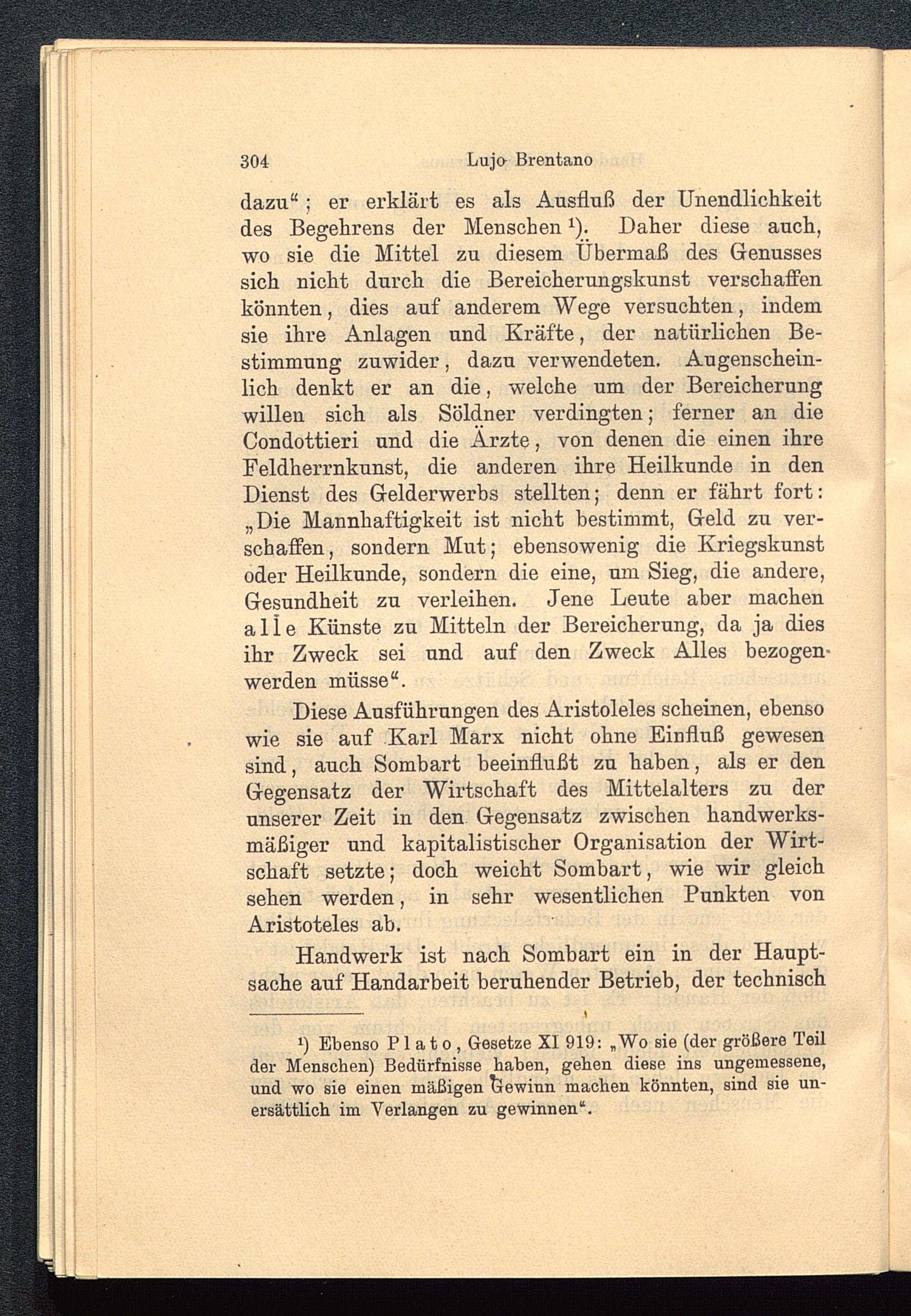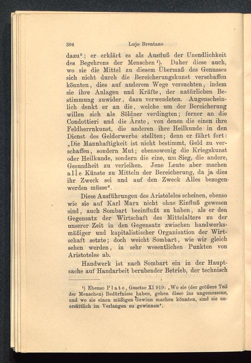 Diese Ausführungen des Aristoleles scheinen, ebensowie sie auf Karl Marx nicht ohne Einfluß gewesensind, auch Sombart beeinflußt zu haben, als er denGegensatz der Wirtschaft des Mittelalters zu derunserer Zeit in den Gegensatz zwischen handwerks-mäßiger und kapitalistischer Organisation der Wirt-schaft setzte; doch weicht Sombart, wie wir gleichsehen werden, in sehr wesentlichen Punkten vonAristoteles ab.