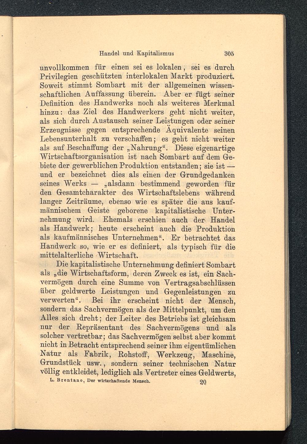 unvollkommen für einen sei es lokalen, sei es durchPrivilegien geschützten interlokalen Markt produziert.Soweit stimmt Sombart mit der allgemeinen wissen-schaftlichen Auffassung überein. Aber er fügt seinerDefinition des Handwerks noch als weiteres Merkmalhinzu: das Ziel des Handwerkers geht nicht weiter,als sich durch Austausch seiner Leistungen oder seinerErzeugnisse gegen entsprechende Äquivalente seinenLebensunterhalt zu verschaffen; es geht nicht weiterals auf Beschaffung der „Nahrung“. Diese eigenartigeWirtschaftsorganisation ist nach Sombart auf dem Ge-biete der gewerblichen Produktion entstanden; sie ist —und er bezeichnet dies als einen der Grundgedankenseines Werks — „alsdann bestimmend geworden fürden Gesamtcharakter des Wirtschaftslebens währendlanger Zeiträume, ebenso wie es später die aus kauf-männischem Geiste geborene kapitalistische Unter-nehmung wird. Ehemals erschien auch der Handelals Handwerk; heute erscheint auch die Produktionals kaufmännisches Unternehmen“. Er betrachtet dasHandwerk so, wie er es definiert, als typisch für diemittelalterliche Wirtschaft.