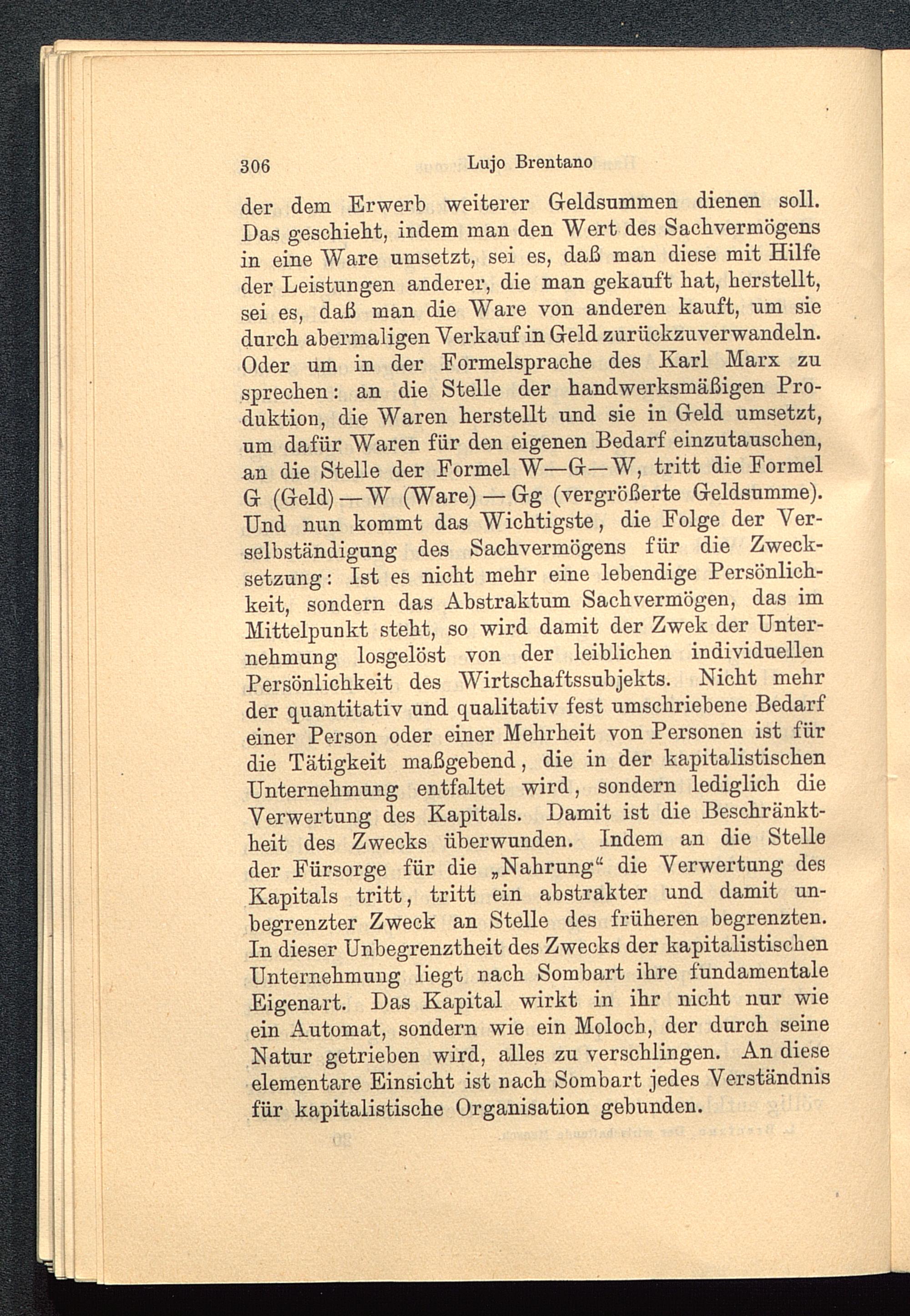 der dem Erwerb weiterer Geldsummen dienen soll.Das geschieht, indem man den Wert des Sachvermögensin eine Ware umsetzt, sei es, daß man diese mit Hilfeder Leistungen anderer, die man gekauft hat, herstellt,sei es, daß man die Ware von anderen kauft, um siedurch abermaligen Verkauf in Geld zurückzuverwandeln.Oder um in der Formelsprache des Karl Marx zusprechen: an die Stelle der handwerksmäßigen Pro-duktion, die Waren herstellt und sie in Geld umsetzt,um dafür Waren für den eigenen Bedarf einzutauschen,an die Stelle der Formel W—G—W, tritt die FormelG (Geld)—W (Ware) — Gg (vergrößerte Geldsumme).Und nun kommt das Wichtigste, die Folge der Ver-selbständigung des Sachvermögens für die Zweck-setzung : Ist es nicht mehr eine lebendige Persönlich-keit, sondern das Abstraktum Sachvermögen, das imMittelpunkt steht, so wird damit der Zwek der Unter-nehmung losgelöst von der leiblichen individuellenPersönlichkeit des Wirtschaftssubjekts. Nicht mehrder quantitativ und qualitativ fest umschriebene Bedarfeiner Person oder einer Mehrheit von Personen ist fürdie Tätigkeit maßgebend, die in der kapitalistischen Unternehmung entfaltet wird, sondern lediglich dieVerwertung des Kapitals. Damit ist die Beschränkt-heit des Zwecks überwunden. Indem an die Stelleder Fürsorge für die „Nahrung“ die Verwertung desKapitals tritt, tritt ein abstrakter und damit un-begrenzter Zweck an Stelle des früheren begrenzten.In dieser Unbegrenztheit des Zwecks der kapitalistischen Unternehmung liegt nach Sombart ihre fundamentaleEigenart. Das Kapital wirkt in ihr nicht nur wieein Automat, sondern wie ein Moloch, der durch seineNatur getrieben wird, alles zu verschlingen. An dieseelementare Einsicht ist nach Sombart jedes Verständnisfür kapitalistische Organisation gebunden.