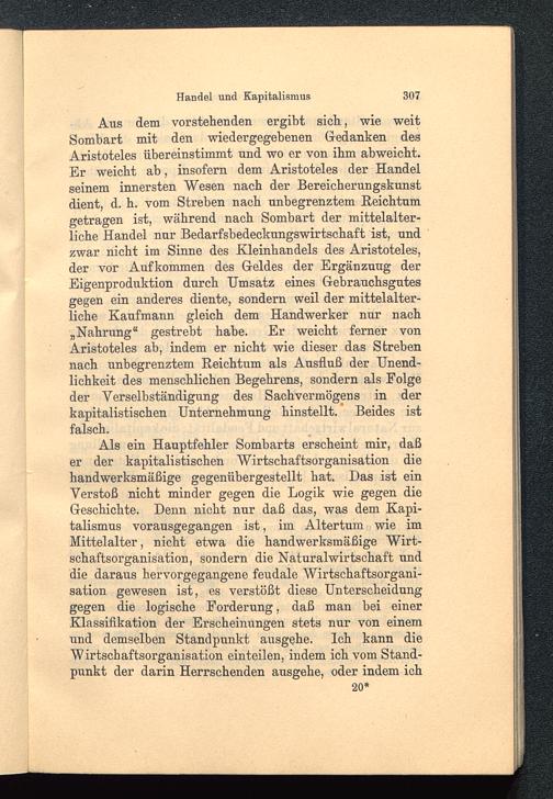 Aus dem vorstehenden ergibt sich, wie weitSomhart mit den wiedergegebenen Gedanken desAristoteles übereinstimmt und wo er von ihm abweicht.Er weicht ab, insofern dem Aristoteles der Handelseinem innersten Wesen nach der Bereicherungskunstdient, d. h. vom Streben nach unbegrenztem Reichtumgetragen ist, während nach Somhart der mittelalter-liche Handel nur Bedarfsbedeckungswirtschaft ist, undzwar nicht im Sinne des Kleinhandels des Aristoteles,der vor Aufkommen des Geldes der Ergänzung derEigenproduktion durch Umsatz eines Gehrauchsgutesgegen ein anderes diente, sondern weil der mittelalter-liche Kaufmann gleich dem Handwerker nur nach„Nahrung“ gestrebt habe. Er weicht ferner vonAristoteles ah, indem er nicht wie dieser das Strebennach unbegrenztem Reichtum als Ausfluß der Unend-lichkeit des menschlichen Begehrens, sondern als Folgeder Verselbständigung des Sachvermögens in derkapitalistischen Unternehmung hinstellt. Beides istfalsch.