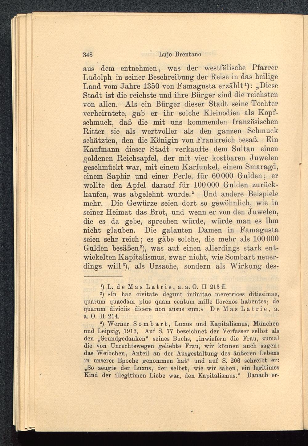 aus dem entnehmen, was der westfälische PfarrerLudolph in seiner Beschreibung der Reise in das heiligeLand vom Jahre 1350 von Famagusta erzählt 1 ): „DieseStadt ist die reichste und ihre Bürger sind die reichstenvon allen. Als ein Bürger dieser Stadt seine Tochterverheiratete, gab er ihr solche Kleinodien als Kopf-schmuck, daß die mit uns kommenden französischenRitter sie als wertvoller als den ganzen Schmuckschätzten, den die Königin von Frankreich besaß. EinKaufmann dieser Stadt verkaufte dem Sultan einengoldenen Reichsapfel, der mit vier kostbaren Juwelengeschmückt war, mit einem Karfunkel, einem Smaragd,einem Saphir und einer Perle, für 60000 Gulden; erwollte den Apfel darauf für 100000 Gulden zurück-kaufen, was abgelehnt wurde.“ Und andere Beispielemehr. Die Gewürze seien dort so gewöhnlich, wie inseiner Heimat das Brot, und wenn er von den Juwelen,die es da gehe, sprechen würde, würde man es ihmnicht glauben. Die galanten Damen in Famagusta seien sehr reich; es gäbe solche, die mehr als 100 000Gulden besäßen 2 ), was auf einen allerdings stark ent-wickelten Kapitalismus, zwar nicht, wie Sombart neuer-dings will 3 ), als Ursache, sondern als Wirkung des-