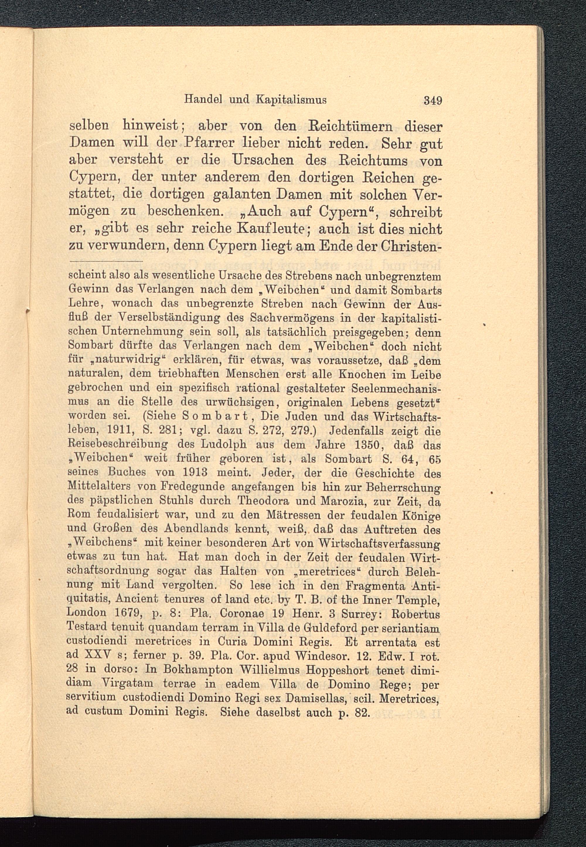 seheint also als wesentliche Ursache des Strebens nach unbegrenztemGewinn das Verlangen nach dem „Weibchen“ und damit SombartsLehre, wonach das unbegrenzte Streben nach Gewinn der Aus-fluß der Verselbständigung des Sachvermögens in der kapitalisti-schen Unternehmung sein soll, als tatsächlich preisgegeben; dennSombart dürfte das Verlangen nach dem „Weibchen“ doch nichtfür „naturwidrig“ erklären, für etwas, was voraussetze, daß „demnaturalen, dem triebhaften Menschen erst alle Knochen im Leibegebrochen und ein spezifisch rational gestalteter Seelenmechanis-mus an die Stelle des urwüchsigen, originalen Lebens gesetzt“worden sei. (Siehe Sombart , Die Juden und das Wirtschafts-leben, 1911, S. 281; vgl. dazu S. 272, 279.) Jedenfalls zeigt dieReisebeschreibung des Ludolph aus dem Jahre 1350, daß das„Weibchen“ weit früher geboren ist, als Sombart S. 64, 65seines Buches von 1913 meint. Jeder, der die Geschichte desMittelalters von Fredegunde angefangen bis hin zur Beherrschungdes päpstlichen Stuhls durch Theodora und Marozia, zur Zeit, daRom feudalisiert war, und zu den Mätressen der feudalen Königeund Großen des Abendlands kennt, weiß, daß das Auftreten des„Weibchens“ mit keiner besonderen Art von Wirtschaftsverfassungetwas zu tun hat. Hat man doch in der Zeit der feudalen Wirt-schaftsordnung sogar das Halten von „meretrices“ durch Beleh-nung mit Land vergolten. So lese ich in den Fragmenta Anti-quitatis, Ancient tenures of land etc. by T. B. of the Inner Temple,London 1679, p. 8: Pia. Coronae 19 Henr. 3 Surrey: RobertusTestard tenuit quandam terram in Villa de Guideford per seriantiamcustodiendi meretrices in Curia Domini Regis. Et arrentata estad XXV s; ferner p. 39. Pia. Cor. apud Windesor. 12. Edw. I rot.28 in dorso: In Bokhampton Willielmus Hoppeshort tenet dimi-diam Virgatam terrae in eadem Villa de Domino Rege; perservitium custodiendi Domino Regi sex Damisellas, seil. Meretrices,ad custum Domini Regis. Siehe daselbst auch p. 82.