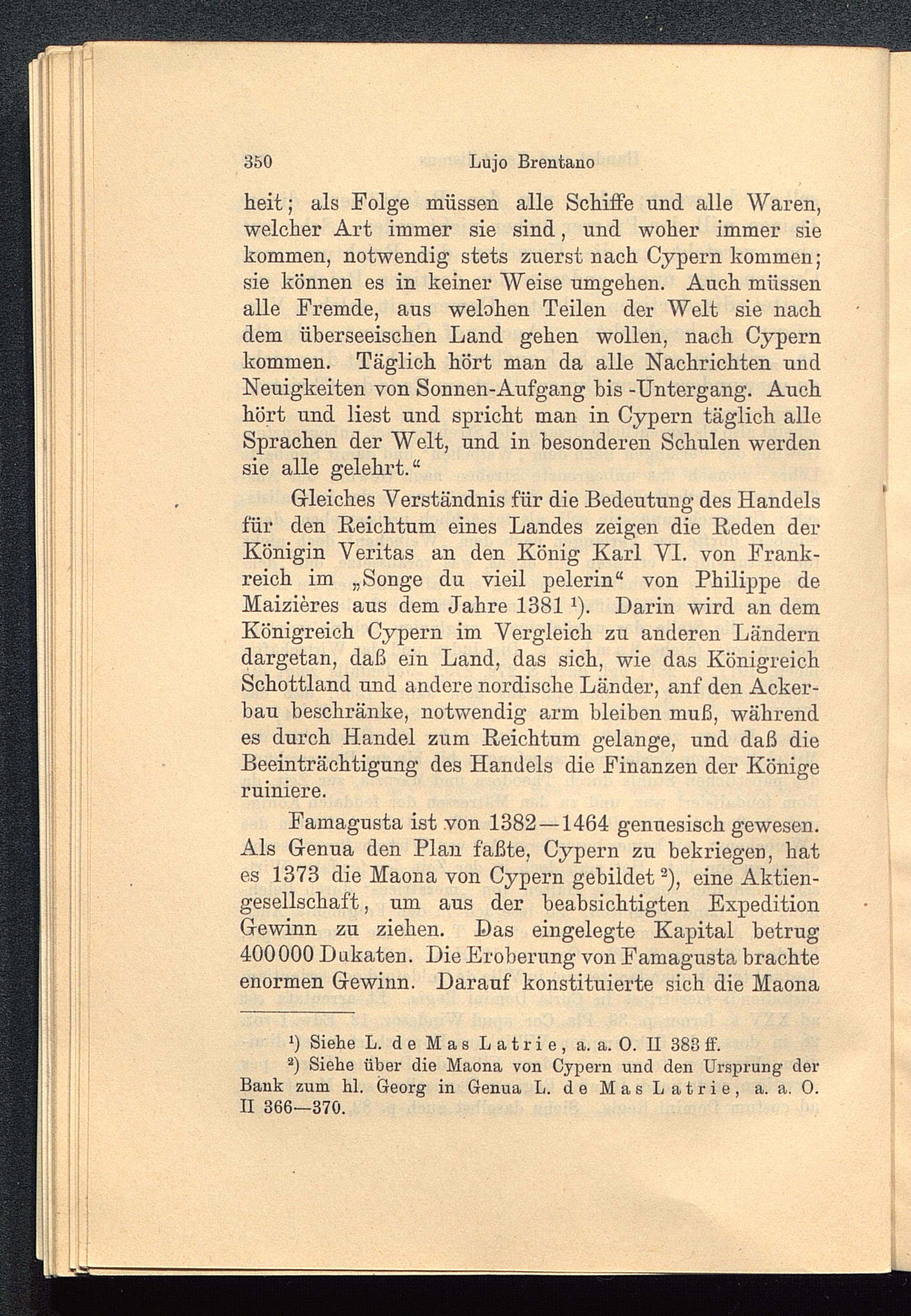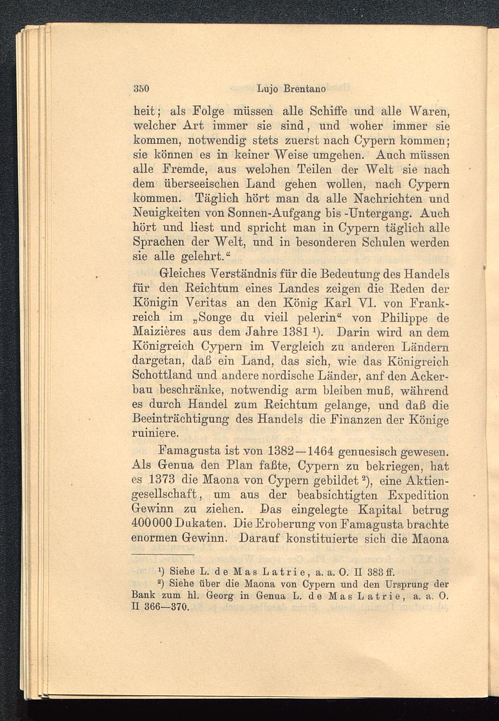Gleiches Verständnis für die Bedeutung des Handelsfür den Reichtum eines Landes zeigen die Reden derKönigin Veritas an den König Karl VI. von Frank-reich im „Songe du vieil pelerin“ von Philippe deMaizieres aus dem Jahre 1381 1 ). Darin wird an demKönigreich Cypern im Vergleich zu anderen Länderndargetan, daß ein Land, das sich, wie das KönigreichSchottland und andere nordische Länder, anf den Acker-bau beschränke, notwendig arm bleiben muß, währendes durch Handel zum Reichtum gelange, und daß dieBeeinträchtigung des Handels die Finanzen der Königeruiniere.