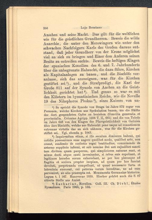 Ansehen und seine Macht. Das gilt für die weltlichenwie für die geistlichen Grundherren. Beweis die wildeAnarchie, die unter den Merowingern wie unter denschwachen Nachfolgern Karls des Großen daraus ent-stand, daß jeder Grundherr von der Krone möglichstviel an sich zu bringen und Einer dem Anderen seinenBesitz zu entreißen suchte. Beweis die heftigen Klagender spanischen Konzilien des 6. und 7. Jahrhundertsüber die unbegrenzte Habsucht, die dazu führe, Kirchenals Kapitalanlagen zu bauen, und die Bischöfe ver-anlasse, sich das anzueignen, was für die Kirchengestiftet sei'), und die Strafpredigt, die Karl derGroße 811 auf der Synode von Aachen an die Geist-lichkeit gerichtet hat * 2 ). Und genau so war es mitden Klöstern im byzantinischen Reiche, wie die Novelle19 des Nikephoros Phokas 3 * * * * 8 ), eines Kaisers von un-