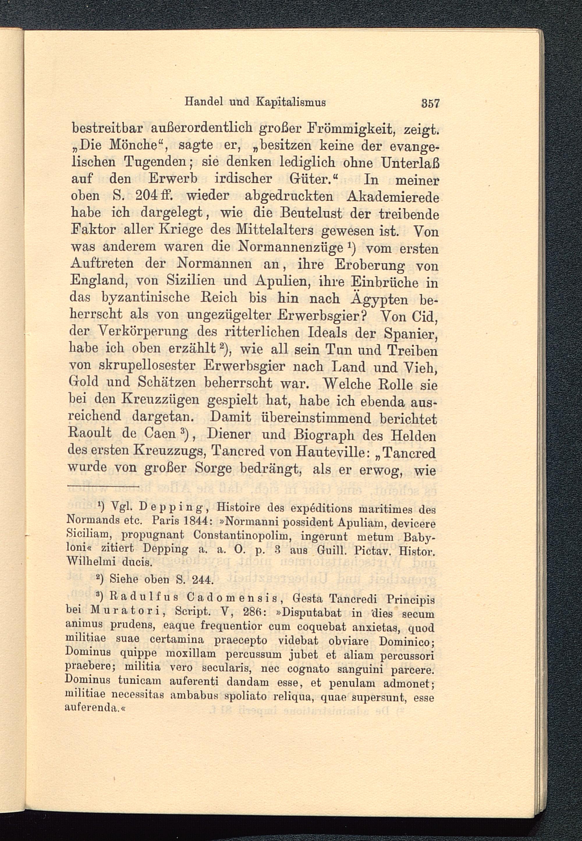 bestreitbar außerordentlich großer Frömmigkeit, zeigt.„Die Mönche“, sagte er, „besitzen keine der evange-lischen Tugenden; sie denken lediglich ohne Unterlaßauf den Erwerb irdischer Güter.“ In meineroben S. 204 ff. wieder abgedruckten Akademieredehabe ich dargelegt, wie die Beutelust der treibendeFaktor aller Kriege des Mittelalters gewesen ist. Vonwas anderem waren die Normannenzüge *) vom erstenAuftreten der Normannen an, ihre Eroberung vonEngland, von Sizilien und Apulien , ihre Einbrüche indas byzantinische Reich bis hin nach Ägypten be-herrscht als von ungezügelter Erwerbsgier? Von Cid,der Verkörperung des ritterlichen Ideals der Spanier,habe ich oben erzählt * 2 ), wie all sein Tun und Treibenvon skrupellosester Erwerbsgier nach Land und Vieh,Gold und Schätzen beherrscht war. Welche Rolle siebei den Kreuzzügen gespielt hat, habe ich ebenda aus-reichend dargetan. Damit übereinstimmend berichtetRaoult de Caen 3 ), Diener und Biograph des Heldendes ersten Kreuzzugs, Tancred von Hauteville: „Tancred wurde von großer Sorge bedrängt, als er erwog, wie