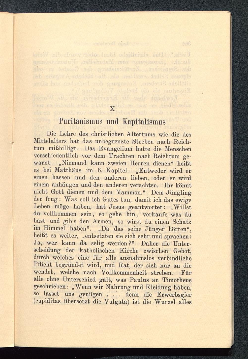 Die Lehre des christlichen Altertums wie die desMittelalters hat das unbegrenzte Streben nach Reich-tum mißbilligt. Das Evangelium hatte die Menschenverschiedentlich vor dem Trachten nach Reichtum ge-warnt. „Niemand kann zweien Herren dienen“ heißtes bei Matthäus im 6. Kapitel. „Entweder wird ereinen hassen und den anderen lieben, oder er wirdeinem anhängen und den anderen verachten. Ihr könntnicht Gott dienen und dem Mammon.“ Dem Jünglingder trug : Was soll ich Gutes tun, damit ich das ewigeLeben möge haben, hat Jesus geantwortet: „Willstdu vollkommen sein, so gehe hin, verkaufe was duhast und gib’s den Armen, so wirst du einen Schatzim Himmel haben“. „Da das seine Jünger hörten“,heißt es weiter, „entsetzten sie sich sehr und sprachen:Ja, wer kann da selig werden?“ Daher die Unter-scheidung der katholischen Kirche zwischen Gebot,durch welches eine für alle ausnahmslos verbindlichePflicht begründet wird, und Rat, der sich nur an diewendet, welche nach Vollkommenheit streben. Füralle ohne Unterschied galt, was Paulus an Timotheus geschrieben: „Wenn wir Nahrung und Kleidung haben,so lasset uns genügen . . . denn die Erwerhsgier(eupiditas übersetzt die Vulgata ) ist die Wurzel alles