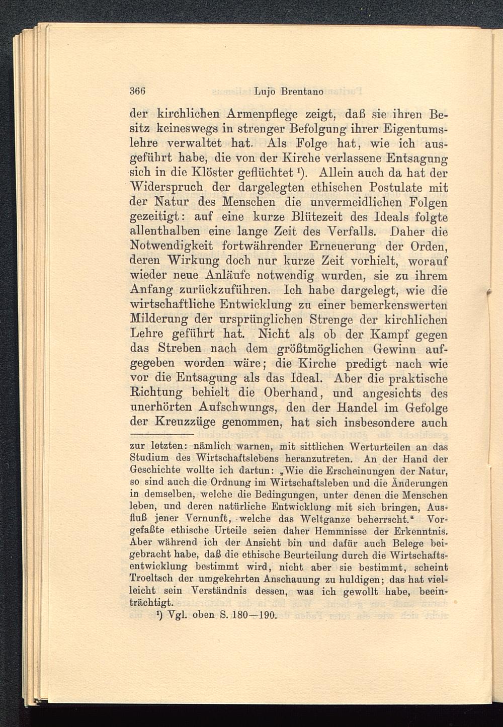 zur letzten: nämlich warnen, mit sittlichen Werturteilen an dasStudium des Wirtschaftslebens heranzutreten. An der Hand derGeschichte wollte ich dartun: „Wie die Erscheinungen der Natur,so sind auch die Ordnung im Wirtschaftsleben und die Änderungenin demselben, welche die Bedingungen, unter denen die Menschenleben, und deren natürliche Entwicklung mit sich bringen, Aus-fluß jener Vernunft, welche das Weltganze beherrscht.“ Vor-gefaßte ethische Urteile seien daher Hemmnisse der Erkenntnis.Aber während ich der Ansicht bin und dafür auch Belege bei-gebracht habe, daß die ethische Beurteilung durch die Wirtschafts-entwicklung bestimmt wird, nicht aber sie bestimmt, scheintTroeltsch der umgekehrten Anschauung zu huldigen; das hat viel-leicht sein Verständnis dessen, was ich gewollt habe, beein-trächtigt.