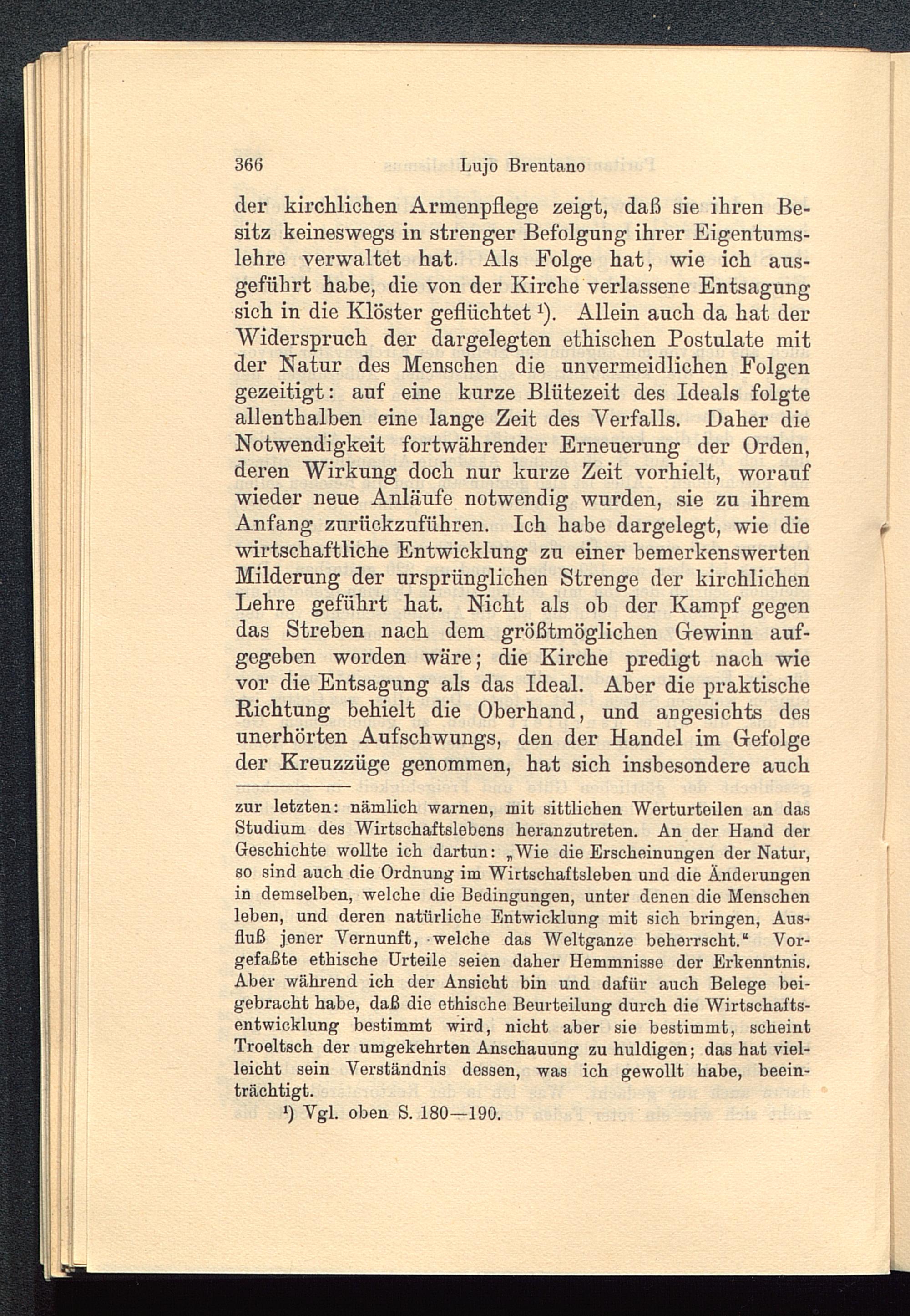 der kirchlichen Armenpflege zeigt, daß sie ihren Be-sitz keineswegs in strenger Befolgung ihrer Eigentums-lehre verwaltet hat. Als Folge hat, wie ich aus-geführt habe, die von der Kirche verlassene Entsagungsich in die Klöster geflüchtet 1 ). Allein auch da hat derWiderspruch der dargelegten ethischen Postulate mitder Natur des Menschen die unvermeidlichen Folgengezeitigt: auf eine kurze Blütezeit des Ideals folgteallenthalben eine lange Zeit des Verfalls. Daher dieNotwendigkeit fortwährender Erneuerung der Orden,deren Wirkung doch nur kurze Zeit vorhielt, woraufwieder neue Anläufe notwendig wurden, sie zu ihremAnfang zurückzuführen. Ich habe dargelegt, wie diewirtschaftliche Entwicklung zu einer bemerkenswertenMilderung der ursprünglichen Strenge der kirchlichenLehre geführt hat. Nicht als oh der Kampf gegendas Streben nach dem größtmöglichen Gewinn auf-gegeben worden wäre; die Kirche predigt nach wievor die Entsagung als das Ideal. Aber die praktischeRichtung behielt die Oberhand, und angesichts desunerhörten Aufschwungs, den der Handel im Gefolgeder Kreuzzüge genommen, hat sich insbesondere auch