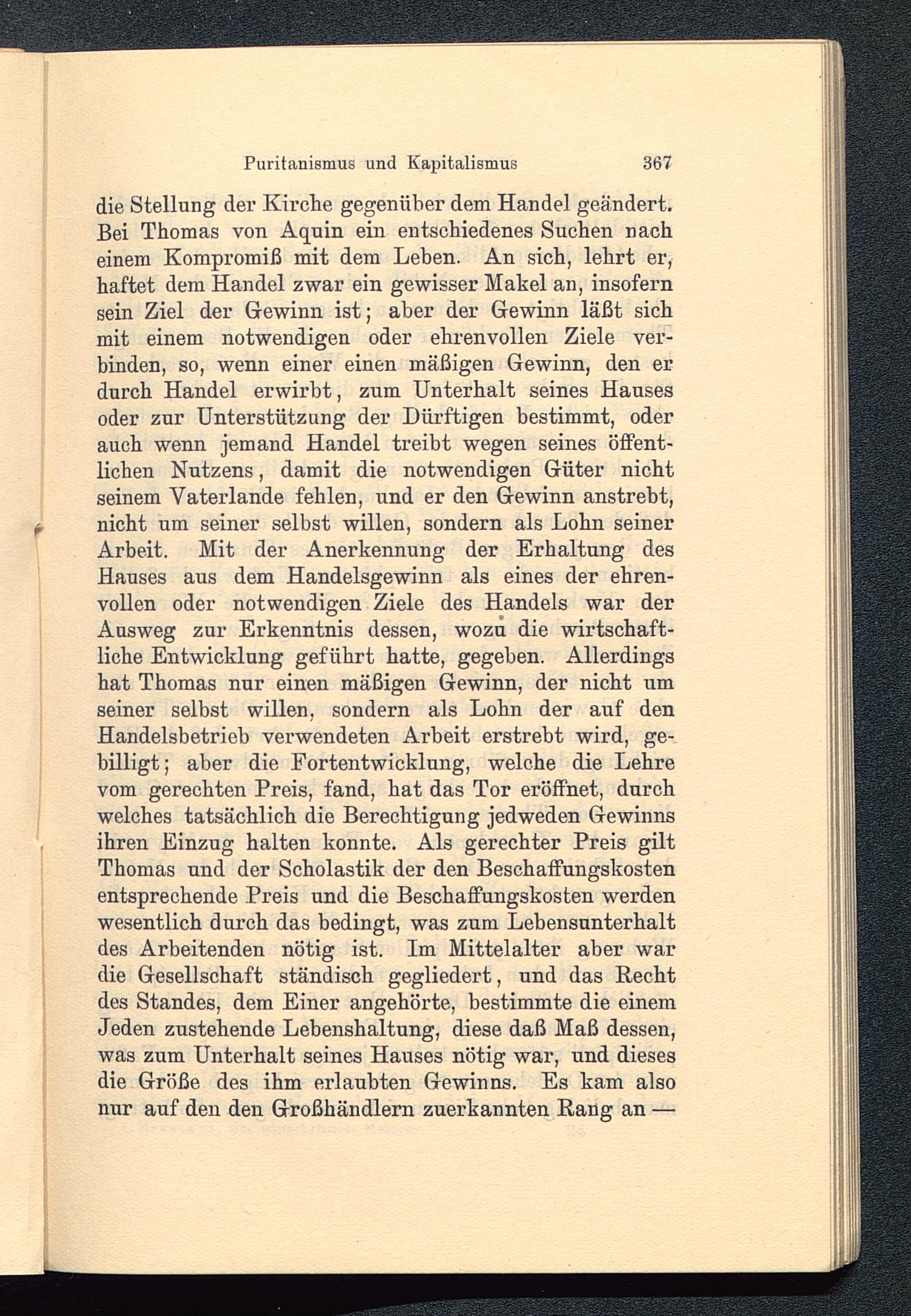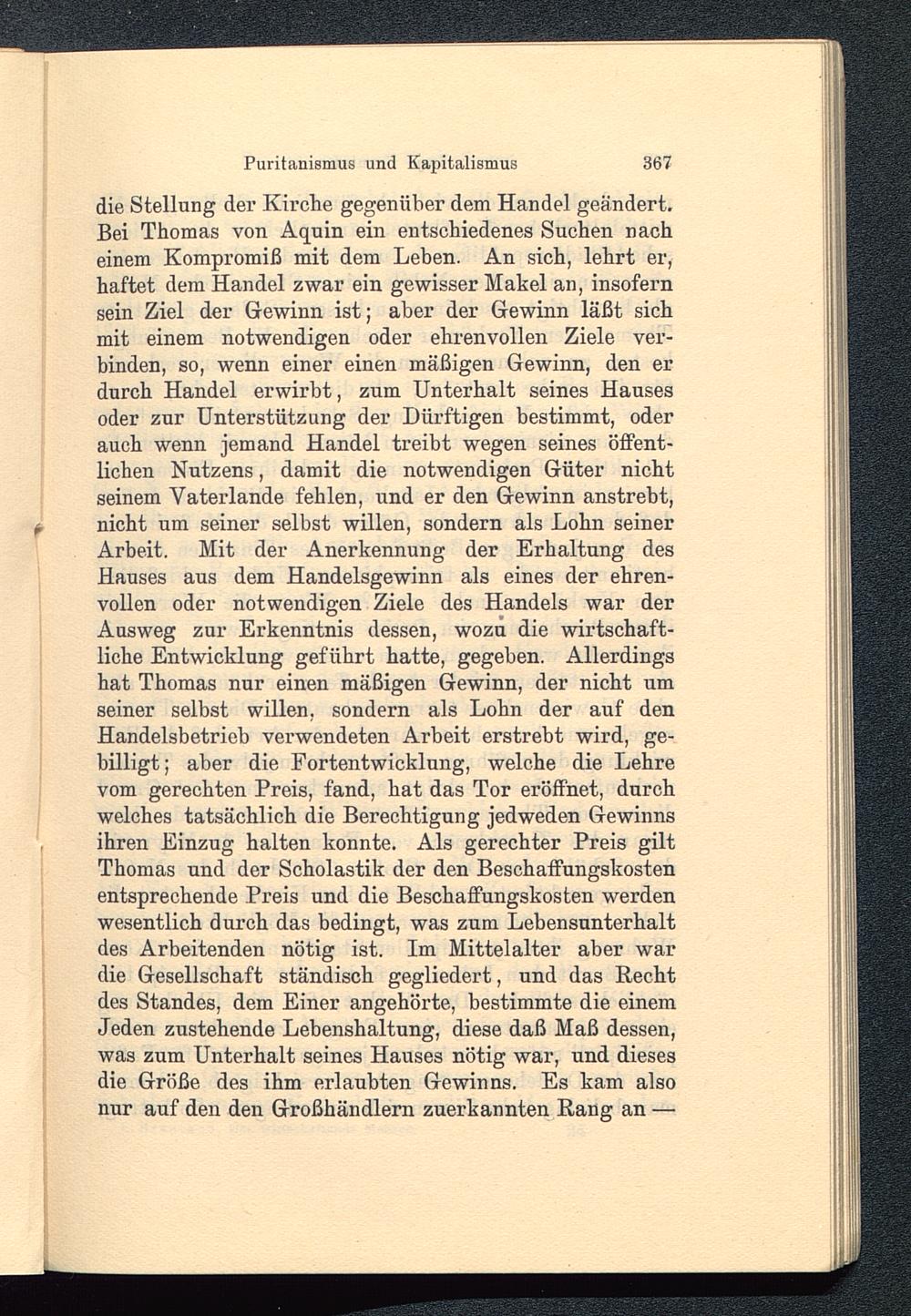 die Stellung der Kirche gegenüber dem Handel geändert.Bei Thomas von Aquin ein entschiedenes Suchen nacheinem Kompromiß mit dem Leben. An sich, lehrt er,haftet dem Handel zwar ein gewisser Makel an, insofernsein Ziel der Gewinn ist; aber der Gewinn läßt sichmit einem notwendigen oder ehrenvollen Ziele ver-binden, so, wenn einer einen mäßigen Gewinn, den erdurch Handel erwirbt, zum Unterhalt seines Hausesoder zur Unterstützung der Dürftigen bestimmt, oderauch wenn jemand Handel treibt wegen seines öffent-lichen Nutzens, damit die notwendigen Güter nichtseinem Vaterlande fehlen, und er den Gewinn anstrebt,nicht um seiner selbst willen, sondern als Lohn seinerArbeit. Mit der Anerkennung der Erhaltung desHauses aus dem Handelsgewinn als eines der ehren-vollen oder notwendigen Ziele des Handels war derAusweg zur Erkenntnis dessen, wozu die wirtschaft-liche Entwicklung geführt hatte, gegeben. Allerdingshat Thomas nur einen mäßigen Gewinn, der nicht umseiner selbst willen, sondern als Lohn der auf denHandelsbetrieb verwendeten Arbeit erstrebt wird, ge-billigt; aber die Fortentwicklung, welche die Lehrevom gerechten Preis, fand, hat das Tor eröffnet, durchwelches tatsächlich die Berechtigung jedweden Gewinnsihren Einzug halten konnte. Als gerechter Preis giltThomas und der Scholastik der den Beschaffungskostenentsprechende Preis und die Beschaffungskosten werdenwesentlich durch das bedingt, was zum Lebensunterhaltdes Arbeitenden nötig ist. Im Mittelalter aber wardie Gesellschaft ständisch gegliedert, und das Rechtdes Standes, dem Einer angehörte, bestimmte die einemJeden zustehende Lebenshaltung, diese daß Maß dessen,was zum Unterhalt seines Hauses nötig war, und diesesdie Größe des ihm erlaubten Gewinns. Es kam alsonur auf den den Großhändlern zuerkannten Rang an —