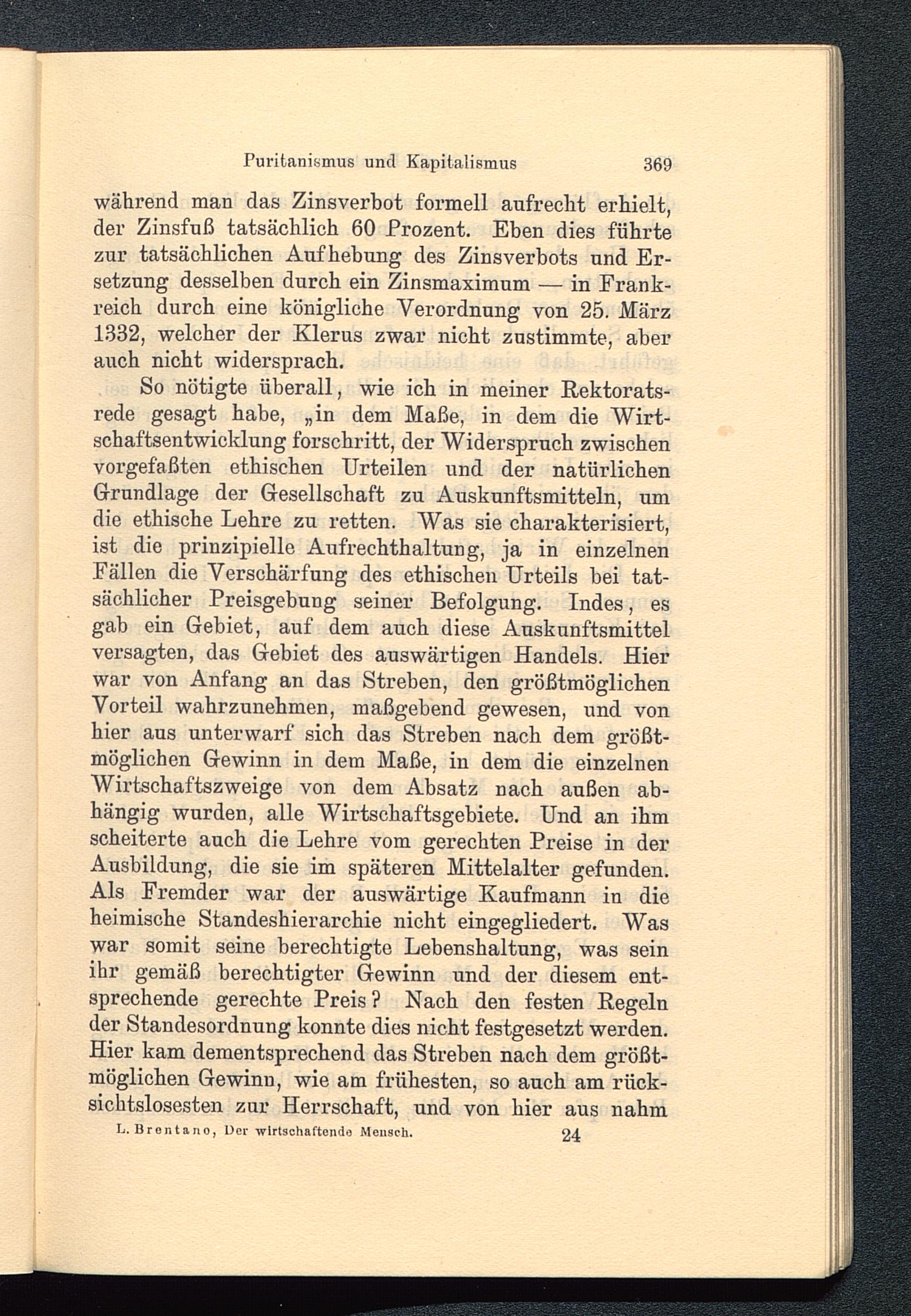 So nötigte überall, wie ich in meiner Rektorats-rede gesagt habe, „in dem Maße, in dem die Wirt-schaftsentwicklung forschritt, der Widerspruch zwischenvorgefaßten ethischen Urteilen und der natürlichenGrundlage der Gesellschaft zu Auskunftsmitteln, umdie ethische Lehre zu retten. Was sie charakterisiert,ist die prinzipielle Aufrechthaltung, ja in einzelnenFällen die Verschärfung des ethischen Urteils bei tat-sächlicher Preisgebung seiner Befolgung. Indes, esgab ein Gebiet, auf dem auch diese Auskunftsmittelversagten, das Gebiet des auswärtigen Handels. Hierwar von Anfang an das Streben, den größtmöglichenVorteil wahrzunehmen, maßgebend gewesen, und vonhier aus unterwarf sich das Streben nach dem größt-möglichen Gewinn in dem Maße, in dem die einzelnenWirtschaftszweige von dem Absatz nach außen ab-hängig wurden, alle Wirtschaftsgebiete. Und an ihmscheiterte auch die Lehre vom gerechten Preise in derAusbildung, die sie im späteren Mittelalter gefunden.Als Fremder war der auswärtige Kaufmann in dieheimische Standeshierarchie nicht eingegliedert. Waswar somit seine berechtigte Lebenshaltung, was seinihr gemäß berechtigter Gewinn und der diesem ent-sprechende gerechte Preis ? Nach den festen Regelnder Standesordnung konnte dies nicht festgesetzt werden.Hier kam dementsprechend das Streben nach dem größt-möglichen Gewinn, wie am frühesten, so auch am rück-sichtslosesten zur Herrschaft, und von hier aus nahm
