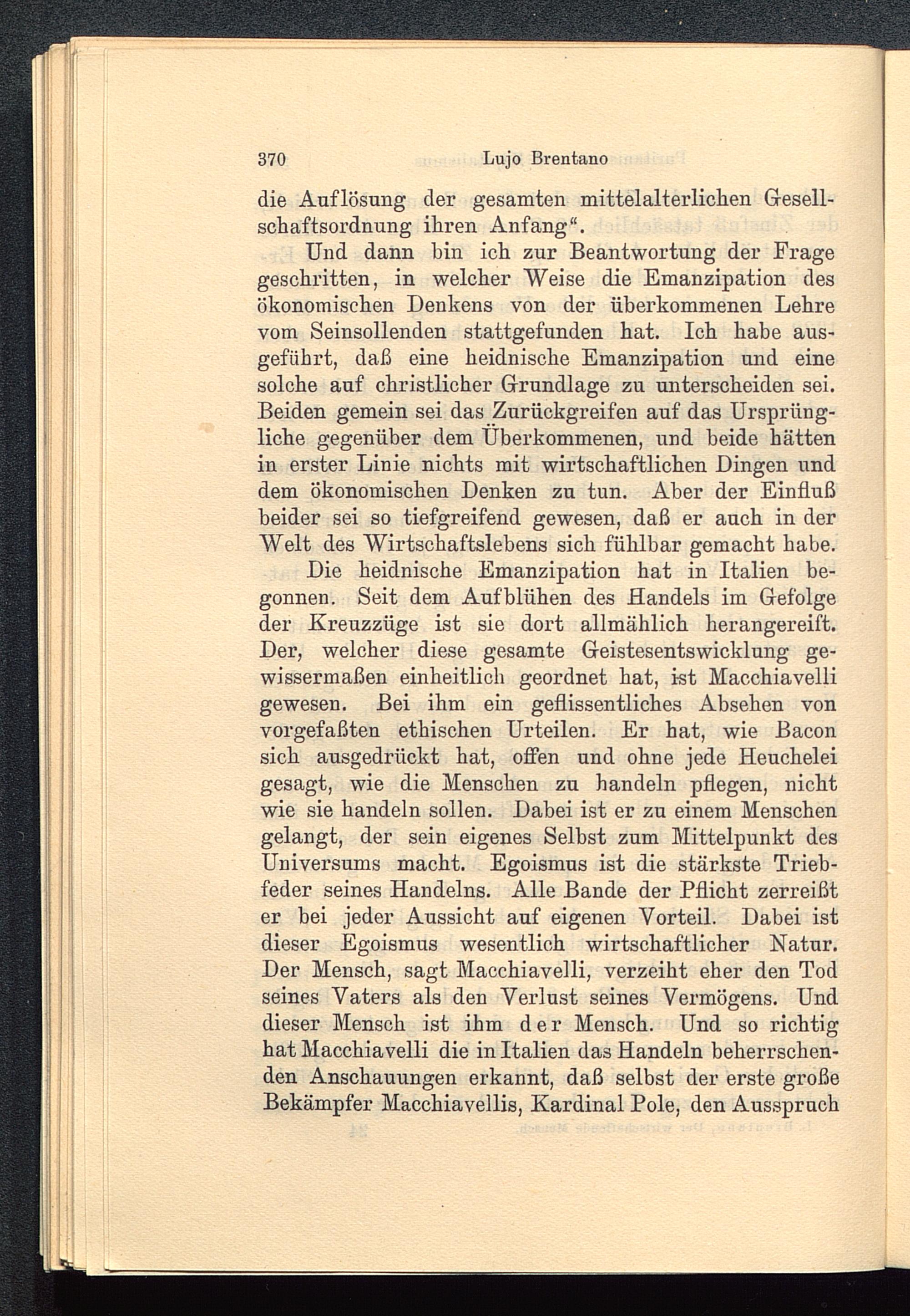 Die heidnische Emanzipation hat in Italien be-gonnen. Seit dem Aufblühen des Handels im Gefolgeder Kreuzzüge ist sie dort allmählich herangereift.Der, welcher diese gesamte Geistesentswicklung ge-wissermaßen einheitlich geordnet hat, ist Macchiavelligewesen. Bei ihm ein geflissentliches Absehen vonvorgefaßten ethischen Urteilen. Er hat, wie Baconsich ausgedrückt hat, offen und ohne jede Heucheleigesagt, wie die Menschen zu handeln pflegen, nichtwie sie handeln sollen. Dabei ist er zu einem Menschengelangt, der sein eigenes Selbst zum Mittelpunkt desUniversums macht. Egoismus ist die stärkste Trieb-feder seines Handelns. Alle Bande der Pflicht zerreißter bei jeder Aussicht auf eigenen Vorteil. Dabei istdieser Egoismus wesentlich wirtschaftlicher Natur.Der Mensch, sagt Macchiavelli, verzeiht eher den Todseines Vaters als den Verlust seines Vermögens. Unddieser Mensch ist ihm der Mensch. Und so richtighat Macchiavelli die in Italien das Handeln beherrschen-den Anschauungen erkannt, daß selbst der erste großeBekämpfer Macchiavellis, Kardinal Pole, den Ausspruch