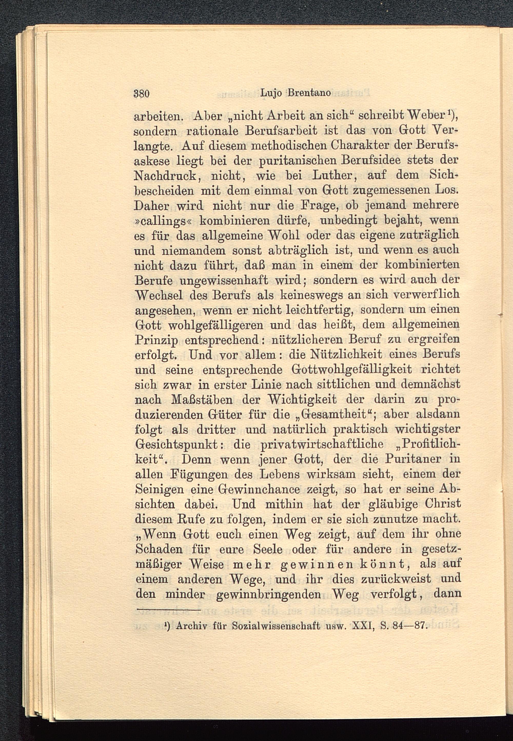 arbeiten. Aber „nicht Arbeit an sich“ schreibt Weber 1 ),sondern rationale Berufsarbeit ist das von Gott Ver-langte . Auf diesem methodischen Charakter der Berufs-askese liegt bei der puritanischen Berufsidee stets derNachdruck, nicht, wie bei Luther, auf dem Sich-bescheiden mit dem einmal von Gott zugemessenen Los.Daher wird nicht nur die Frage, ob jemand mehrere»callings« kombinieren dürfe, unbedingt bejaht, wennes für das allgemeine Wohl oder das eigene zuträglichund niemandem sonst abträglich ist, und wenn es auchnicht dazu führt, daß man in einem der kombiniertenBerufe ungewissenhaft wird; sondern es wird auch derWechsel des Berufs als keineswegs an sich verwerflichangesehen, wenn er nicht leichtfertig, sondern um einenGott wohlgefälligeren und das heißt, dem allgemeinenPrinzip entsprechend: nützlicheren Beruf zu ergreifenerfolgt. Und vor allem: die Nützlichkeit eines Berufsund seine entsprechende Gottwohlgefälligkeit richtetsich zwar in erster Linie nach sittlichen und demnächstnach Maßstäben der Wichtigkeit der darin zu pro-duzierenden Güter für die „Gesamtheit“; aber alsdannfolgt als dritter und natürlich praktisch wichtigsterGesichtspunkt: die privatwirtschaftliche „Profitlich-keit“. Denn wenn jener Gott, der die Puritaner inallen Fügungen des Lebens wirksam sieht, einem derSeinigen eine Gewinnchance zeigt, so hat er seine Ab-sichten dabei. Und mithin hat der gläubige Christdiesem Rufe zu folgen, indem er sie sich zunutze macht.„Wenn Gott euch einen Weg zeigt, auf dem ihr ohneSchaden für eure Seele oder für andere in gesetz-mäßiger Weise mehr gewinnen könnt, als aufeinem anderen Wege, und ihr dies zurückweist undden minder gewinnbringenden Weg verfolgt, dann