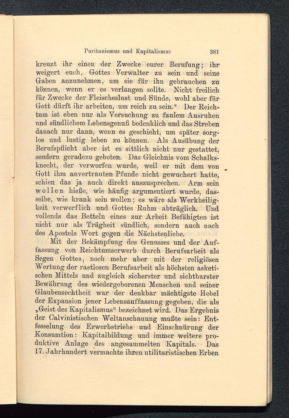 kreuzt ihr einen der Zwecke eurer Berufung; ihrweigert euch, Gottes Verwalter zu sein und seineGaben anzunehmen, um sie für ihn gebrauchen zukönnen, wenn er es verlangen sollte. Nicht freilichfür Zwecke der Fleischeslust und Sünde, wohl aber fürGott dürft ihr arbeiten, um reich zu sein.“ Der Reich-tum ist eben nur als Versuchung zu faulem Ausruhenund sündlichem Lebensgenuß bedenklich und das Strebendanach nur dann, wenn es geschieht, um später sorg-los und lustig leben zu können. Als Ausübung derBerufspflicht aber ist es sittlich nicht nur gestattet,sondern geradezu geboten. Das Gleichnis vom Schalks-knecht, der verworfen wurde, weil er mit dem vonGott ihm anvertrauten Pfunde nicht gewuchert hatte,schien das ja auch direkt auszusprechen. Arm seinwollen hieße, wie häufig argumentiert wurde, das-selbe, wie krank sein wollen; es wäre als Werkheilig-keit verwerflich und Gottes Ruhm abträglich. Undvollends das Betteln eines zur Arbeit Befähigten istnicht nur als Trägheit sündlich, sondern auch nachdes Apostels Wort gegen die Nächstenliebe.