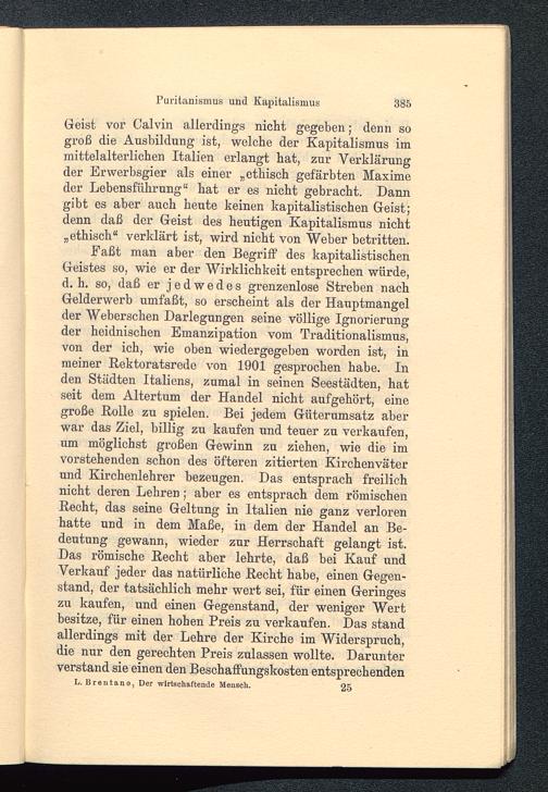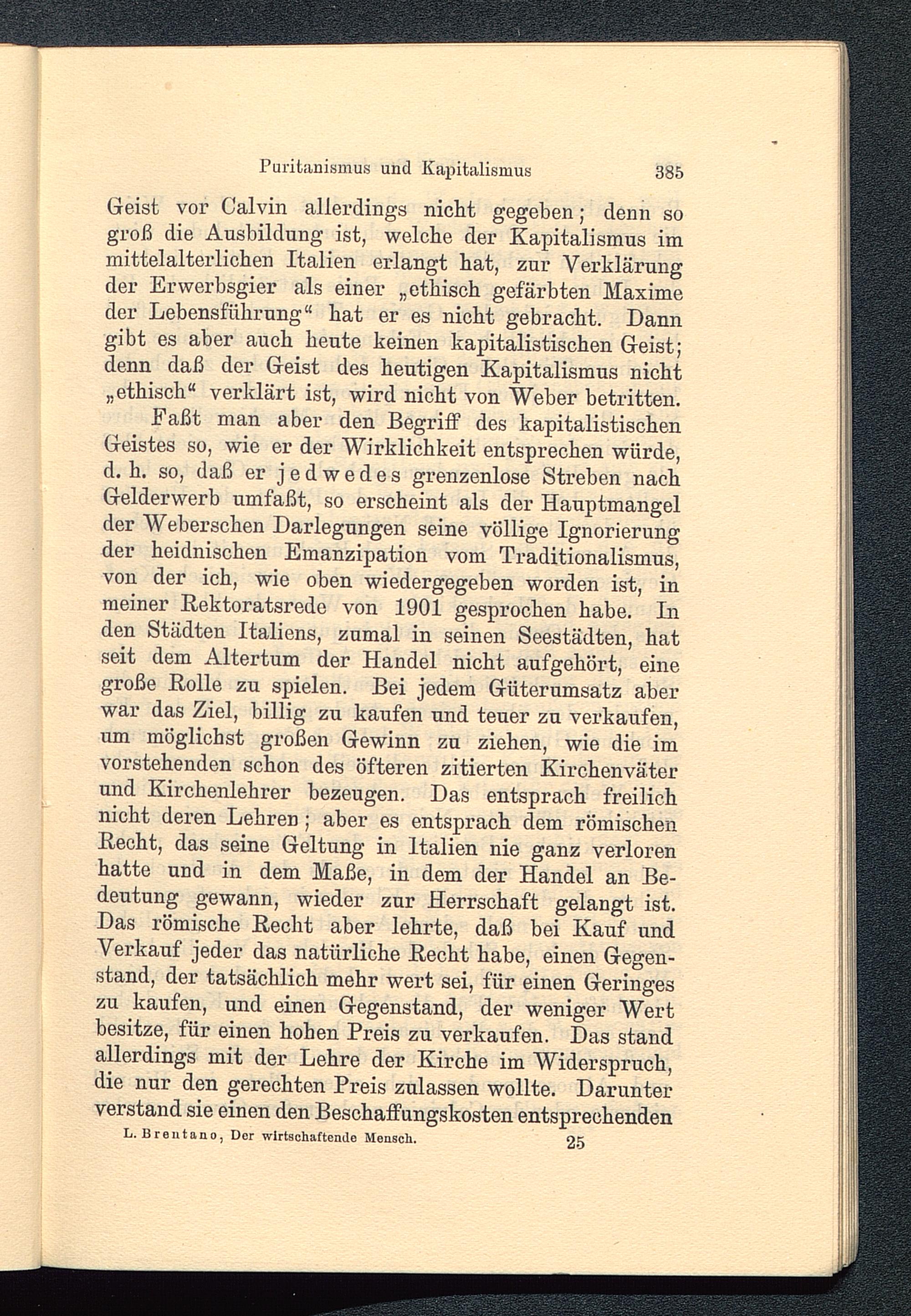 Geist vor Calvin allerdings nicht gegeben; denn sogroß die Ausbildung ist, welche der Kapitalismus immittelalterlichen Italien erlangt hat, zur Verklärungder Erwerbsgier als einer „ethisch gefärbten Maximeder Lebensführung“ hat er es nicht gebracht. Danngibt es aber auch heute keinen kapitalistischen Geist;denn daß der Geist des heutigen Kapitalismus nicht„ethisch“ verklärt ist, wird nicht von Weber betritten.