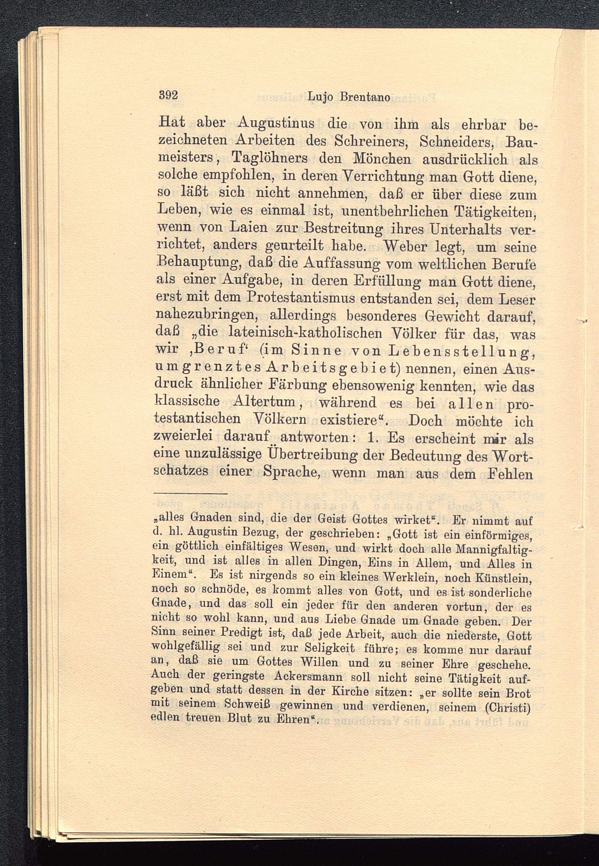 Hat aber Augustinus die von ihm als ehrbar be-zeichnten Arbeiten des Schreiners, Schneiders, Bau-meisters , Taglöhners den Mönchen ausdrücklich alssolche empfohlen, in deren Verrichtung man Gott diene,so läßt sich nicht annehmen, daß er über diese zumLeben, wie es einmal ist, unentbehrlichen Tätigkeiten,wenn von Laien zur Bestreitung ihres Unterhalts ver-richtet, anders geurteilt habe. Weber legt, um seineBehauptung, daß die Auffassung vom weltlichen Berufeals einer Aufgabe, in deren Erfüllung man Gott diene,erst mit dem Protestantismus entstanden sei, dem Lesernahezubringen, allerdings besonderes Gewicht darauf,daß „die lateinisch-katholischen Völker für das, waswir ,Beruf' (im Sinne von Lebensstellung,umgrenztesArbeitsgebiet) nennen, einen Aus-druck ähnlicher Färbung ebensowenig kennten, wie dasklassische Altertum, während es bei allen pro-testantischen Völkern existiere“. Doch möchte ichzweierlei darauf antworten: 1. Es erscheint mir alseine unzulässige Übertreibung der Bedeutung des Wort-schatzes einer Sprache, wenn man aus dem Fehlen