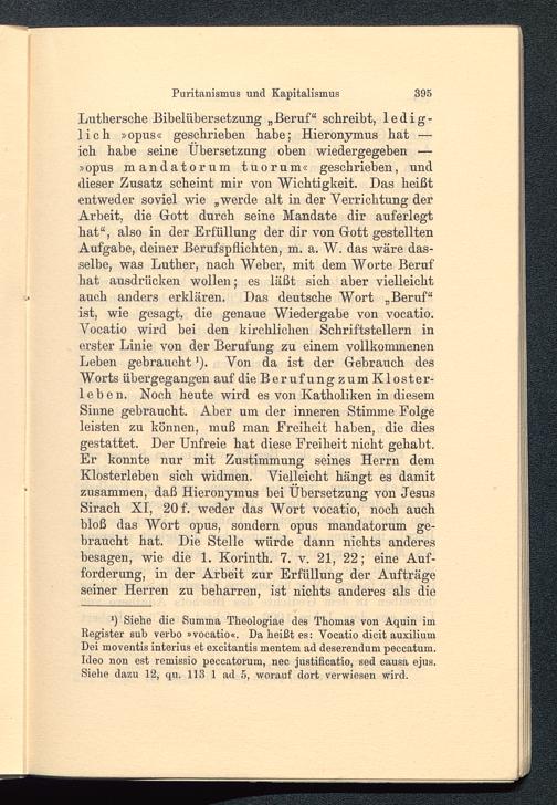Lutliersche Bibelübersetzung „Beruf“ schreibt, ledig-lich »opus« geschrieben habe; Hieronymus hat —ich habe seine Übersetzung oben wiedergegeben —»opus mandatorum tuorum« geschrieben, unddieser Zusatz scheint mir von Wichtigkeit. Das heißtentweder soviel wie „werde alt in der Verrichtung derArbeit, die Gott durch seine Mandate dir auferlegthat“, also in der Erfüllung der dir von Gott gestelltenAufgabe, deiner Berufspflichten, m. a. W. das wäre das-selbe, was Luther, nach Weber, mit dem Worte Berufhat ausdrücken wollen; es läßt sich aber vielleichtauch anders erklären. Das deutsche Wort „Beruf“ist, wie gesagt, die genaue Wiedergabe von vocatio.Vocatio wird bei den kirchlichen Schriftstellern inerster Linie von der Berufung zu einem vollkommenenLeben gebraucht'). Von da ist der Gebrauch desW orts übergegangen auf die Beruf ungzumKloster-leben. Noch heute wird es von Katholiken in diesemSinne gebraucht. Aber um der inneren Stimme Folgeleisten zu können, muß man Freiheit haben, die diesgestattet. Der Unfreie hat diese Freiheit nicht gehabt.Er konnte nur mit Zustimmung seines Herrn demKlosterleben sich widmen. Vielleicht hängt es damitzusammen, daß Hieronymus bei Übersetzung von JesusSirach XI, 20 f. weder das Wort vocatio, noch auchbloß das Wort opus, sondern opus mandatorum ge-braucht hat. Die Stelle würde dann nichts anderesbesagen, wie die 1. Korinth. 7. v. 21, 22; eine Auf-forderung, in der Arbeit zur Erfüllung der Aufträgeseiner Herren zu beharren, ist nichts anderes als die