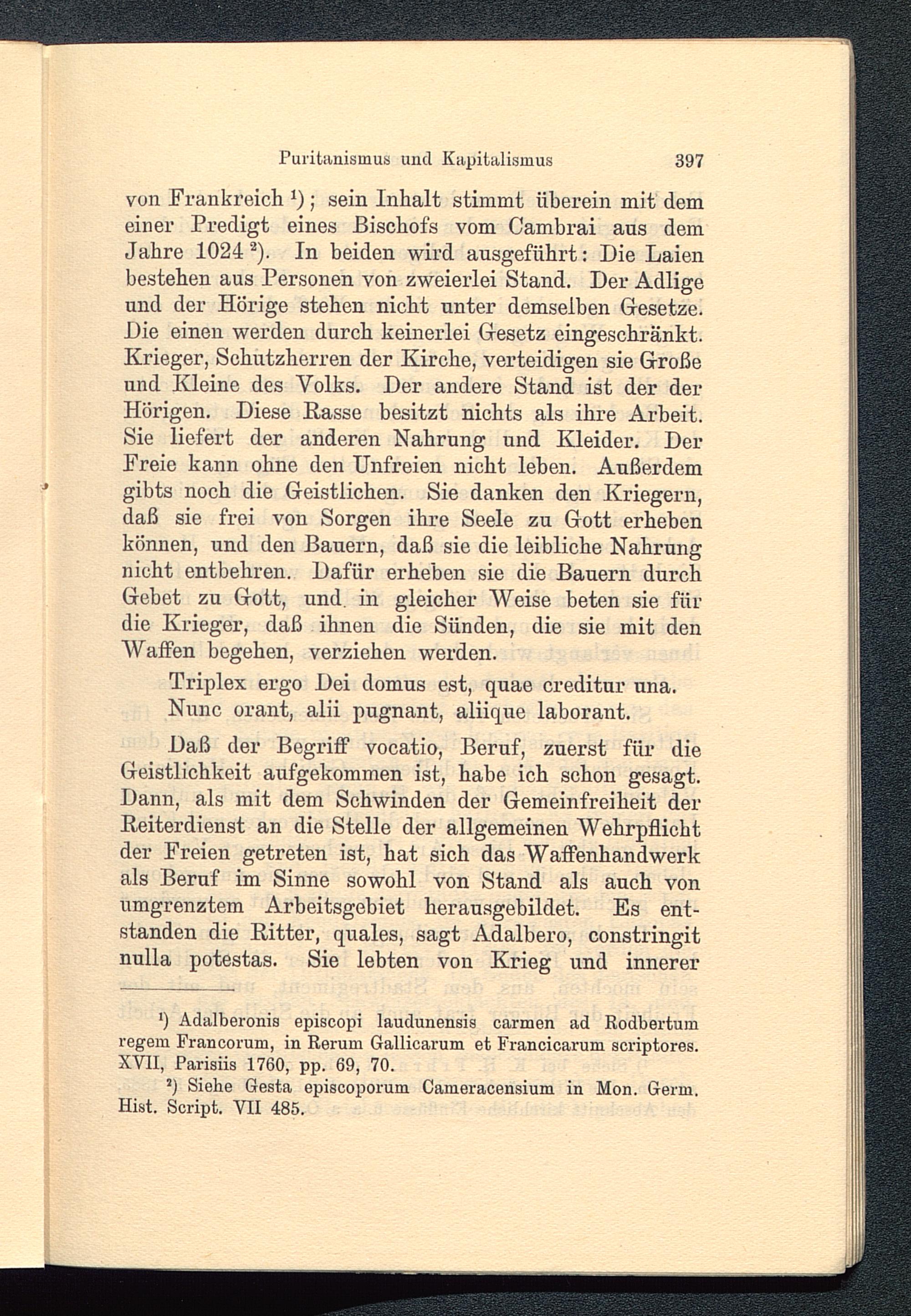 Daß der Begriff vocatio, Beruf, zuerst für dieGeistlichkeit aufgekommen ist, habe ich schon gesagt.Dann, als mit dem Schwinden der Gemeinfreiheit derReiterdienst an die Stelle der allgemeinen Wehrpflichtder Freien getreten ist, hat sich das Waffenhandwerkals Beruf im Sinne sowohl von Stand als auch vonumgrenztem Arbeitsgebiet herausgebildet. Es ent-standen die Ritter, quales, sagt Adalbero, constringitnulla potestas. Sie lebten von Krieg und innerer