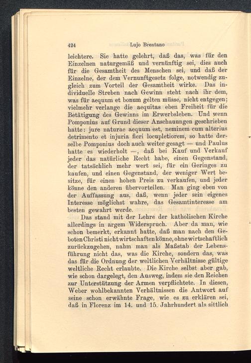 Das stand mit der Lehre der katholischen Kirche allerdings in argem Widerspruch. Aber da man, wieschon bemerkt, erkannt hatte, daß man nach den Ge-boten Christi nicht wirtschaften könne, ohne wirtschaftlichzurückzugehen, nahm man als Maßstab der Lebens-führung nicht das, was die Kirche, sondern das, wasdas für die Ordnung der weltlichen Verhältnisse gültigeweltliche Recht erlaubte. Die Kirche selbst aber gab,wie schon dargelegt, den Ausweg, indem sie den Reichenzur Unterstützung der Armen verpflichtete. In diesen,Weber wohlbekannten Verhältnissen die Antwort aufseine schon erwähnte Frage, wie es zu erklären sei,daß in Florenz im 14. und 15. Jahrhundert als sittlich
