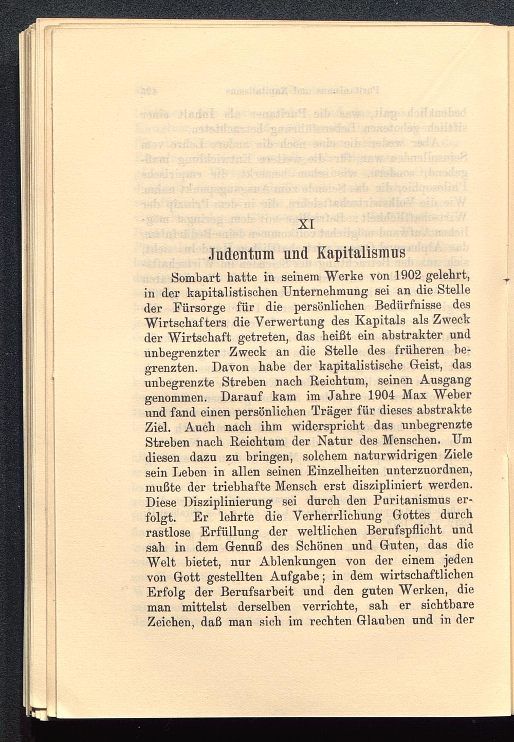 Sombart hatte in seinem Werke von 1902 gelehrt,in der kapitalistischen Unternehmung sei an die Stelleder Fürsorge für die persönlichen Bedürfnisse desWirtschafters die Verwertung des Kapitals als Zweckder Wirtschaft getreten, das heißt ein abstrakter undunbegrenzter Zweck an die Stelle des früheren be-grenzten. Davon habe der kapitalistische (reist, dasunbegrenzte Streben nach Reichtum, seinen Ausganggenommen. Darauf kam im Jahre 1904 Max Weber und fand einen persönlichen Träger für dieses abstrakteZiel. Auch nach ihm widerspricht das unbegrenzteStreben nach Reichtum der Natur des Menschen. Umdiesen dazu zu bringen, solchem naturwidrigen Zielesein Leben in allen seinen Einzelheiten unterzuordnen,mußte der triebhafte Mensch erst diszipliniert werden.Diese Disziplinierung sei durch den Puritanismus er-folgt. Er lehrte die Verherrlichung Gottes durchrastlose Erfüllung der weltlichen Berufspflicht undsah in dem Genuß des Schönen und Guten, das dieWelt bietet, nur Ablenkungen von der einem jedenvon Gott gestellten Aufgabe; in dem wirtschaftlichenErfolg der Berufsarbeit und den guten Werken, dieman mittelst derselben verrichte, sah er sichtbareZeichen, daß man sich im rechten Glauben und in der