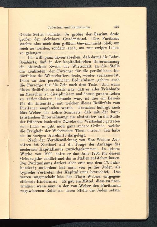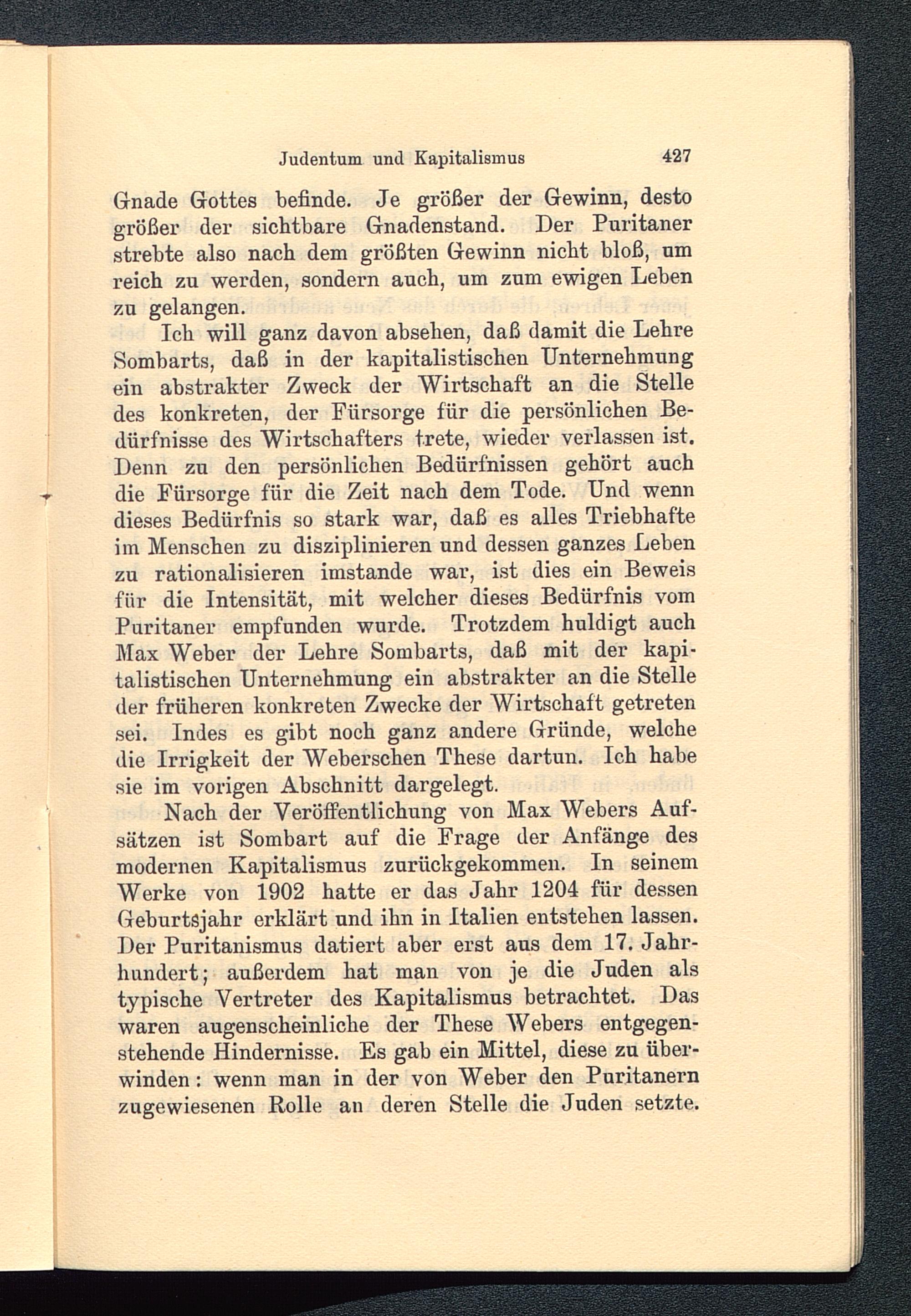 Nach der Veröffentlichung von Max Webers Auf-sätzen ist Sombart auf die Frage der Anfänge desmodernen Kapitalismus zurückgekommen. In seinemWerke von 1902 hatte er das Jahr 1204 für dessenGeburtsjahr erklärt und ihn in Italien entstehen lassen.Der Puritanismus datiert aber erst aus dem 17. Jahr-hundert; außerdem hat man von je die Juden alstypische Vertreter des Kapitalismus betrachtet. Daswaren augenscheinliche der These Webers entgegen-stehende Hindernisse. Es gab ein Mittel, diese zu über-winden : wenn man in der von Weber den Puritanernzugewiesenen Rolle an deren Stelle die Juden setzte.