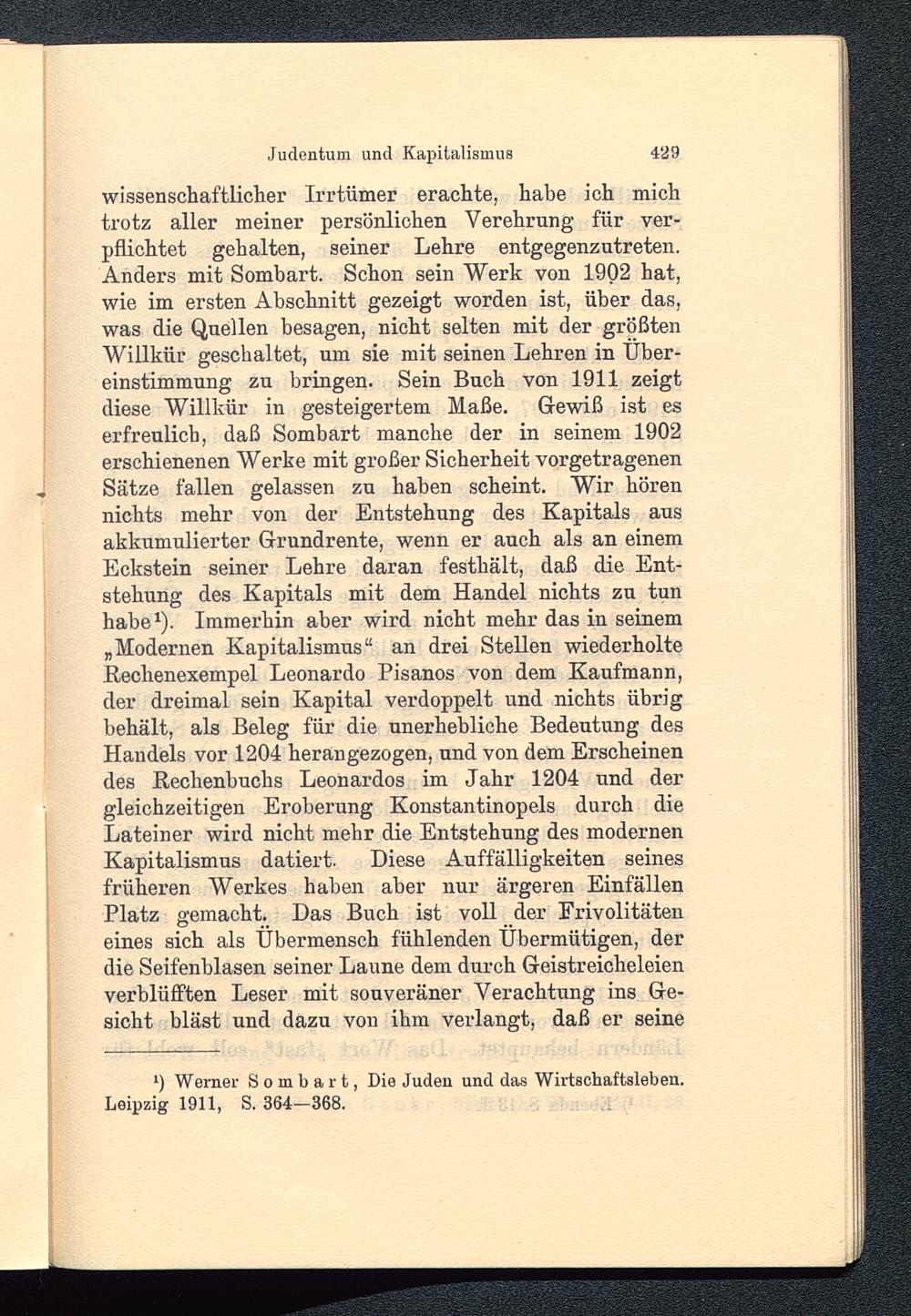 wissenschaftlicher Irrtümer erachte, habe ich michtrotz aller meiner persönlichen Verehrung für ver-pflichtet gehalten, seiner Lehre entgegenzutreten.Anders mit Sombart . Schon sein Werk von 1902 hat,wie im ersten Abschnitt gezeigt worden ist, über das,was die Quellen besagen, nicht selten mit der größtenWillkür geschaltet, um sie mit seinen Lehren in Über-einstimmung zu bringen. Sein Buch von 1911 zeigtdiese Willkür in gesteigertem Maße. Gewiß ist eserfreulich, daß Sombart manche der in seinem 1902erschienenen Werke mit großer Sicherheit vorgetragenenSätze fallen gelassen zu haben scheint. Wir hörennichts mehr von der Entstehung des Kapitals ausakkumulierter Grundrente, wenn er auch als an einemEckstein seiner Lehre daran festhält, daß die Ent-stehung des Kapitals mit dem Handel nichts zu tunhabe 1 ). Immerhin aber wird nicht mehr das in seinem„Modernen Kapitalismus“ an drei Stellen wiederholteRechenexempel Leonardo Pisanos von dem Kaufmann,der dreimal sein Kapital verdoppelt und nichts übrigbehält, als Beleg für die unerhebliche Bedeutung desHandels vor 1204 heran gezogen, und von dem Erscheinendes Rechenbuchs Leonardos im Jahr 1204 und dergleichzeitigen Eroberung Konstantinopels durch dieLateiner wird nicht mehr die Entstehung des modernenKapitalismus datiert. Diese Auffälligkeiten seinesfrüheren Werkes haben aber nur ärgeren EinfällenPlatz gemacht. Das Buch ist voll der Frivolitäteneines sich als Übermensch fühlenden Übermütigen, derdie Seifenblasen seiner Laune dem durch Geistreicheleienverblüfften Leser mit souveräner Verachtung ins Ge-sicht bläst und dazu von ihm verlangt, daß er seine
