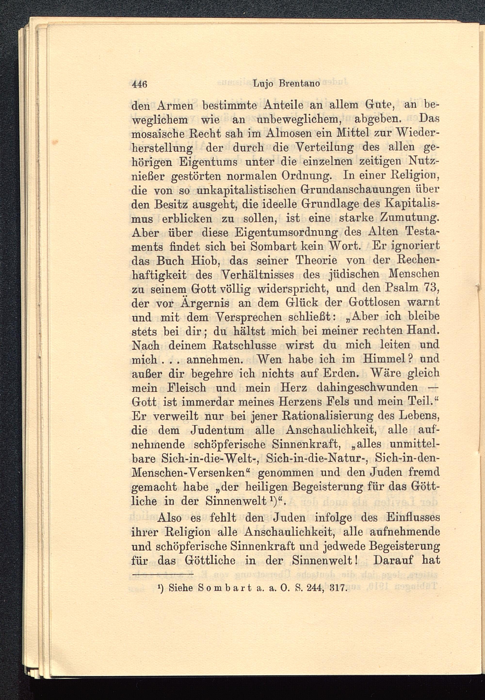 den Armen bestimmte Anteile an allem Gute, an be-weglichem wie an unbeweglichem, abgeben. Dasmosaische Recht sab im Almosen ein Mittel zur Wieder-herstellung der durch die Verteilung des allen ge-hörigen Eigentums unter die einzelnen zeitigen Nutz-nießer gestörten normalen Ordnung. In einer Religion,die von so unkapitalistischen Grundanschauungen überden Besitz ausgeht, die ideelle Grundlage des Kapitalis-mus erblicken zu sollen, ist eine starke Zumutung.Aber über diese Eigentumsordnung des Alten Testa-ments findet sich bei Sombart kein Wort. Er ignoriertdas Buch Hiob , das seiner Theorie von der Rechen-haftigkeit des Verhältnisses des jüdischen Menschenzu seinem Gott völlig widerspricht, und den Psalm 73,der vor Ärgernis an dem Glück der Gottlosen warntund mit dem Versprechen schließt: „Aber ich bleibestets bei dir; du hältst mich bei meiner rechten Hand.Nach deinem Ratschlüsse wirst du mich leiten undmich . . . annehmen. Wen habe ich im Himmel? undaußer dir begehre ich nichts auf Erden. Wäre gleichmein Fleisch und mein Herz dahingeschwunden —Gott ist immerdar meines Herzens Fels und mein Teil.“Er verweilt nur bei jener Rationalisierung des Lebens,die dem Judentum alle Anschaulichkeit, alle auf-nehmende schöpferische Sinnenkraft, „alles unmittel-bare Sich-in-die-Welt-, Sich-in-die-Natur-, Sich-in-den-Menschen-Versenken“ genommen und den Juden fremdgemacht habe „der heiligen Begeisterung für das Gött-liche in der Sinnen weit 1 )“.