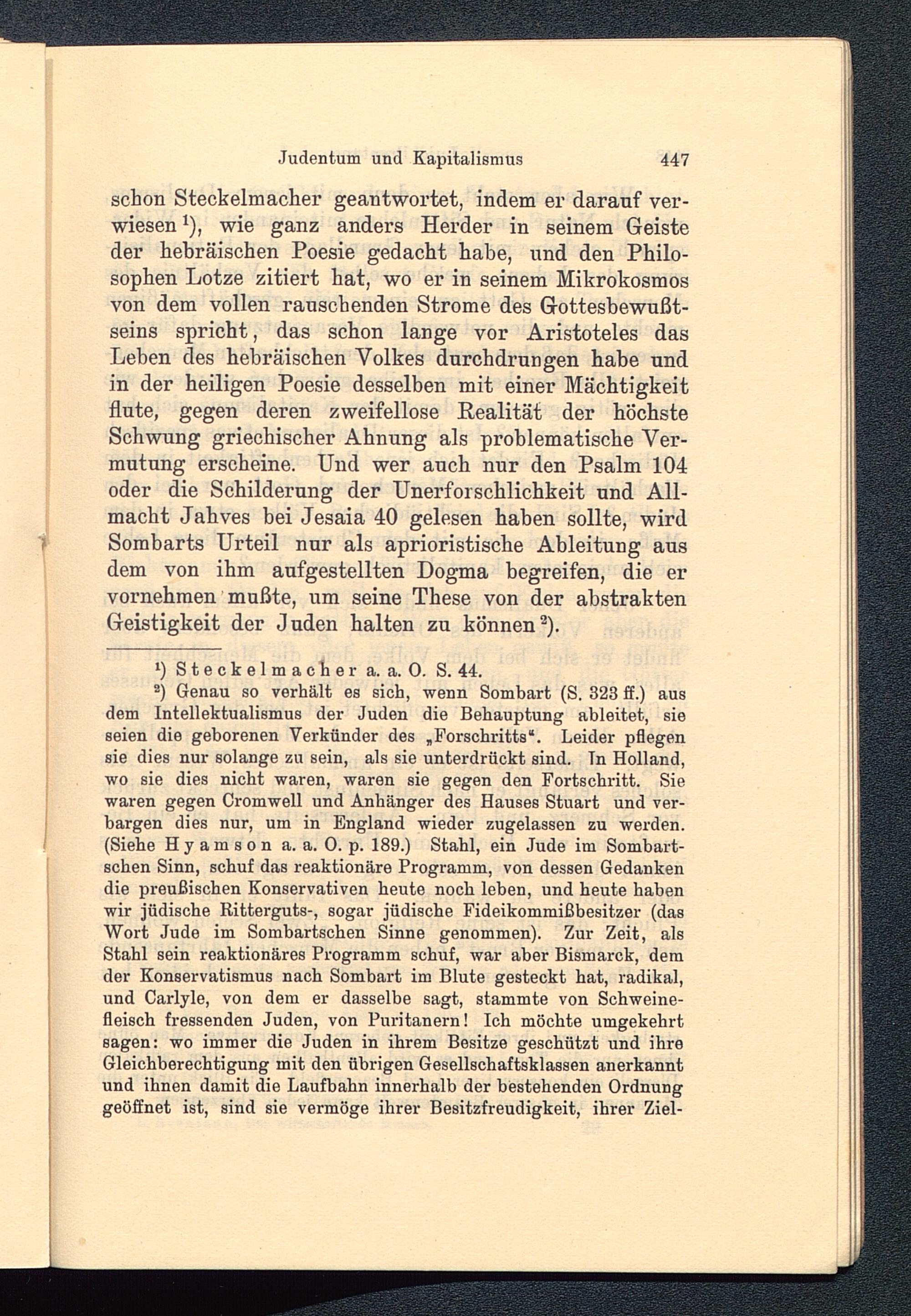 schon Steckelmacher geantwortet, indem er darauf ver-wiesen 1 ), wie ganz anders Herder in seinem Geisteder hebräischen Poesie gedacht habe, und den Philo-sophen Lotze zitiert hat, wo er in seinem Mikrokosmosvon dem vollen rauschenden Strome des Gottesbewußt-seins spricht, das schon lange vor Aristoteles dasLeben des hebräischen Volkes durchdrungen habe undin der heiligen Poesie desselben mit einer Mächtigkeitflute, gegen deren zweifellose Realität der höchsteSchwung griechischer Ahnung als problematische Ver-mutung erscheine. Und wer auch nur den Psalm 104oder die Schilderung der Unerforschlichkeit und All-macht Jahves bei Jesaia 40 gelesen haben sollte, wirdSombarts Urteil nur als aprioristische Ableitung ausdem von ihm aufgestellten Dogma begreifen, die ervornehmen mußte, um seine These von der abstraktenGeistigkeit der Juden halten zu können 2 ).
