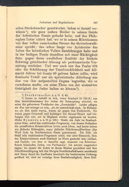 a ) Genau so verhält es sich, wenn Sombart (S, 323 ff.) ausdem Intellektualismus der Juden die Behauptung ableitet, sieseien die geborenen Verkünder des „Forschritts“. Leider pflegensie dies nur solange zu sein, als sie unterdrückt sind. Tn Holland,wo sie dies nicht waren, waren sie gegen den Fortschritt. Siewaren gegen Cromwell und Anhänger des Hauses Stuart und ver-bargen dies nur, um in England wieder zugelassen zu werden.(Siehe Hy amson a. a. 0. p. 189.) Stahl, ein Jude im Sombart- schen Sinn, schuf das reaktionäre Programm, von dessen Gedankendie preußischen Konservativen heute noch leben, und heute habenwir jüdische Ritterguts-, sogar jüdische Fideikommißbesitzer (dasWort Jude im Sombartschen Sinne genommen). Zur Zeit, alsStahl sein reaktionäres Programm schuf, war aber Bismarck, demder Konservatismus nach Sombart im Blute gesteckt hat, radikal,und Carlyle, von dem er dasselbe sagt, stammte von Schweine-fleisch fressenden Juden, von Puritanern! Ich möchte umgekehrtsagen: wo immer die Juden in ihrem Besitze geschützt und ihreGleichberechtigung mit den übrigen Gesellschaftsklassen anerkanntund ihnen damit die Laufbahn innerhalb der bestehenden Ordnunggeöffnet ist, sind sie vermöge ihrer Besitzfreudigkeit, ihrer Ziel-