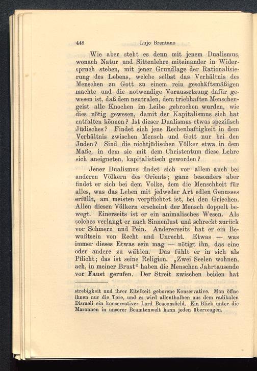 Wie aber steht es denn mit jenem Dualismus,wonach Natur und Sittenlehre miteinander in Wider-spruch stehen, mit jener Grundlage der Rationalisie-rung des Lebens, welche selbst das Verhältnis desMenschen zu Gott zu einem rein geschäftsmäßigenmachte und die notwendige Voraussetzung dafür ge-wesen ist, daß dem neutralen, dem triebhaften Menschen-geist alle Knochen im Leibe gebrochen wurden, wiedies nötig gewesen, damit der Kapitalismus sich hatentfalten können ? Ist dieser Dualismus etwas spezifischJüdisches? Findet sich jene Rechenhaftigkeit in demVerhältnis zwischen Mensch und Gott nur bei denJuden? Sind die nichtjüdischen Völker etwa in demMaße, in dem sie mit dem Christentum diese Lehresich aneigneten, kapitalistisch geworden ?