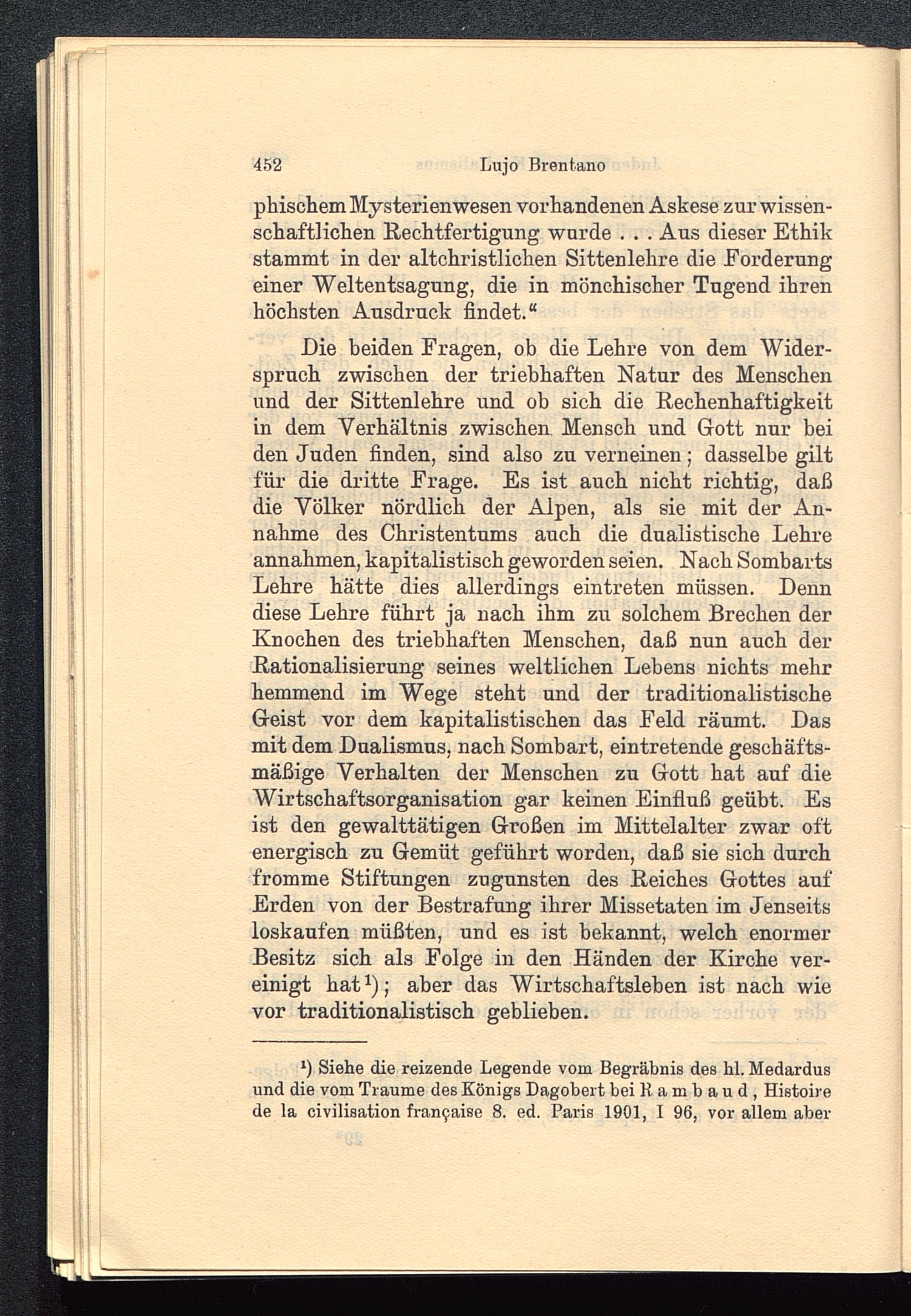 Die beiden Fragen, ob die Lehre von dem Wider-spruch zwischen der triebhaften Natur des Menschenund der Sittenlehre und ob sich die Rechenhaftigkeitin dem Verhältnis zwischen Mensch und Gott nur beiden Juden finden, sind also zu verneinen; dasselbe giltfür die dritte Frage. Es ist auch nicht richtig, daßdie Völker nördlich der Alpen, als sie mit der An-nahme des Christentums auch die dualistische Lehreannahmen, kapitalistisch geworden seien. Nach SombartsLehre hätte dies allerdings eintreten müssen. Denndiese Lehre führt ja nach ihm zu solchem Brechen derKnochen des triebhaften Menschen, daß nun auch derRationalisierung seines weltlichen Lebens nichts mehrhemmend im Wege steht und der traditionalistischeGeist vor dem kapitalistischen das Feld räumt. Dasmit dem Dualismus, nach Sombart , eintretende geschäfts-mäßige Verhalten der Menschen zu Gott hat auf dieWirtschaftsorganisation gar keinen Einfluß geübt. Esist den gewalttätigen Großen im Mittelalter zwar oftenergisch zu Gemüt geführt worden, daß sie sich durchfromme Stiftungen zugunsten des Reiches Gottes aufErden von der Bestrafung ihrer Missetaten im Jenseitsloskaufen müßten, und es ist bekannt, welch enormerBesitz sich als Folge in den Händen der Kirche ver-einigt hat 1 ); aber das Wirtschaftsleben ist nach wievor traditionalistisch geblieben.
