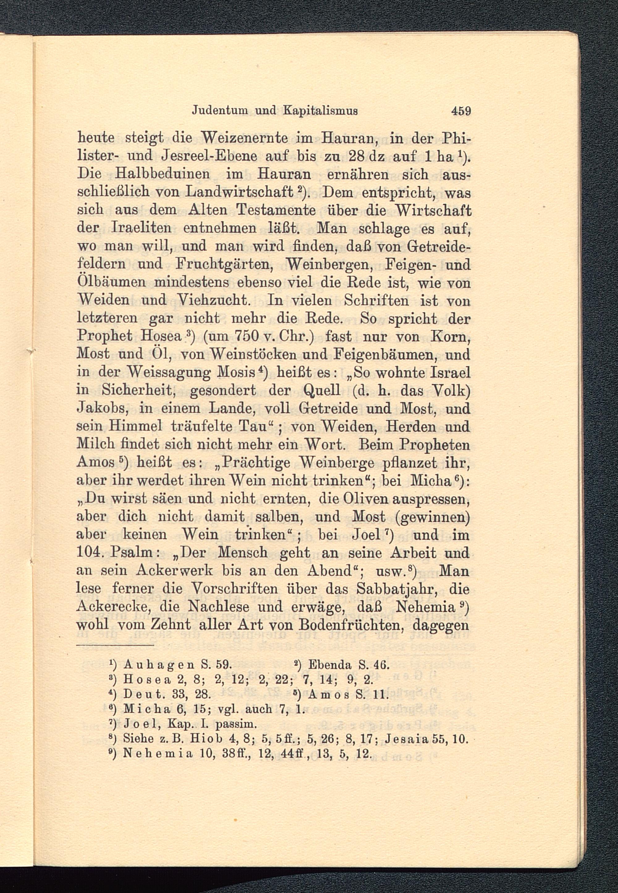 heute steigt die Weizenernte im Hauran, in der Phi-lister- und Jesreel-Ebene auf bis zu 28 dz auf 1ha 1 ).Die Halbbeduinen im Hauran ernähren sich aus-schließlich von Landwirtschaft 2 ). Dem entspricht, wassich aus dem Alten Testamente über die Wirtschaftder Iraeliten entnehmen läßt. Man schlage es auf,wo man will, und man wird finden, daß von Getreide-feldern und Fruchtgärten, Weinbergen, Feigen- undÖlbäumen mindestens ebenso viel die Rede ist, wie vonWeiden und Viehzucht. In vielen Schriften ist vonletzteren gar nicht mehr die Rede. So spricht derProphet Hosea 3 ) (um 750 v. Chr.) fast nur von Korn,Most und 01, von Weinstöcken und Feigenbäumen, undin der Weissagung Mosis 4 ) heißt es: „So wohnte Israelin Sicherheit, gesondert der Quell (d. h. das Volk)Jakobs, in einem Lande, voll Getreide und Most, undsein Himmel träufelte Tau“ ; von Weiden, Herden undMilch findet sich nicht mehr ein Wort. Beim ProphetenArnos 5 ) heißt es: „Prächtige Weinberge pflanzet ihr,aber ihr werdet ihren Wein nicht trinken“; bei Micha 6 ):„Du wirst säen und nicht ernten, die Oliven auspressen,aber dich nicht damit salben, und Most (gewinnen)aber keinen Wein trinken“; bei Joel 7 ) und im104. Psalm: „Der Mensch geht an seine Arbeit undan sein Acker werk bis an den Abend“; usw. 8 ) Manlese ferner die Vorschriften über das Sabbatjahr, dieAckerecke, die Nachlese und erwäge, daß Nehemia 9 )wohl vom Zehnt aller Art von Bodenfrüchten, dagegen