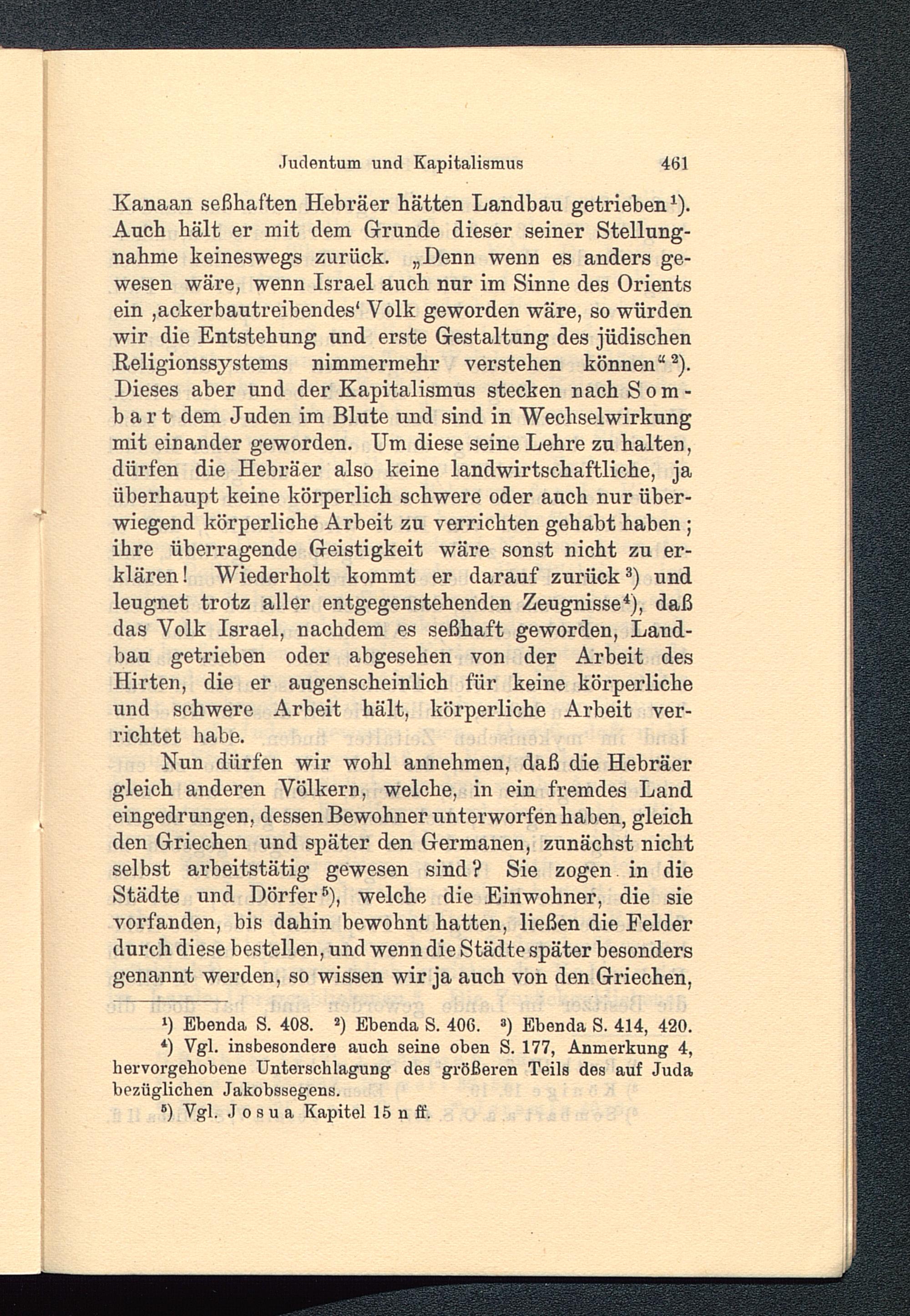 Kanaan seßhaften Hebräer hätten Landbau getrieben 1 ).Auch hält er mit dem Grunde dieser seiner Stellung-nahme keineswegs zurück. „Denn wenn es anders ge-wesen wäre, wenn Israel auch nur im Sinne des Orientsein ,ackerbautreibendes 1 Volk geworden wäre, so würdenwir die Entstehung und erste Gestaltung des jüdischenReligionssystems nimmermehr verstehen können“ 2 ).Dieses aber und der Kapitalismus stecken nach Som-b ar t dem Juden im Blute und sind in Wechselwirkungmit einander geworden. Um diese seine Lehre zu halten,dürfen die Hebräer also keine landwirtschaftliche, jaüberhaupt keine körperlich schwere oder auch nur über-wiegend körperliche Arbeit zu verrichten gehabt haben ;ihre überragende Geistigkeit wäre sonst nicht zu er-klären ! Wiederholt kommt er darauf zurück 3 ) undleugnet trotz aller entgegen stehenden Zeugnisse 4 5 ), daßdas Volk Israel, nachdem es seßhaft geworden, Land-bau getrieben oder abgesehen von der Arbeit desHirten, die er augenscheinlich für keine körperlicheund schwere Arbeit hält, körperliche Arbeit ver-richtet habe.