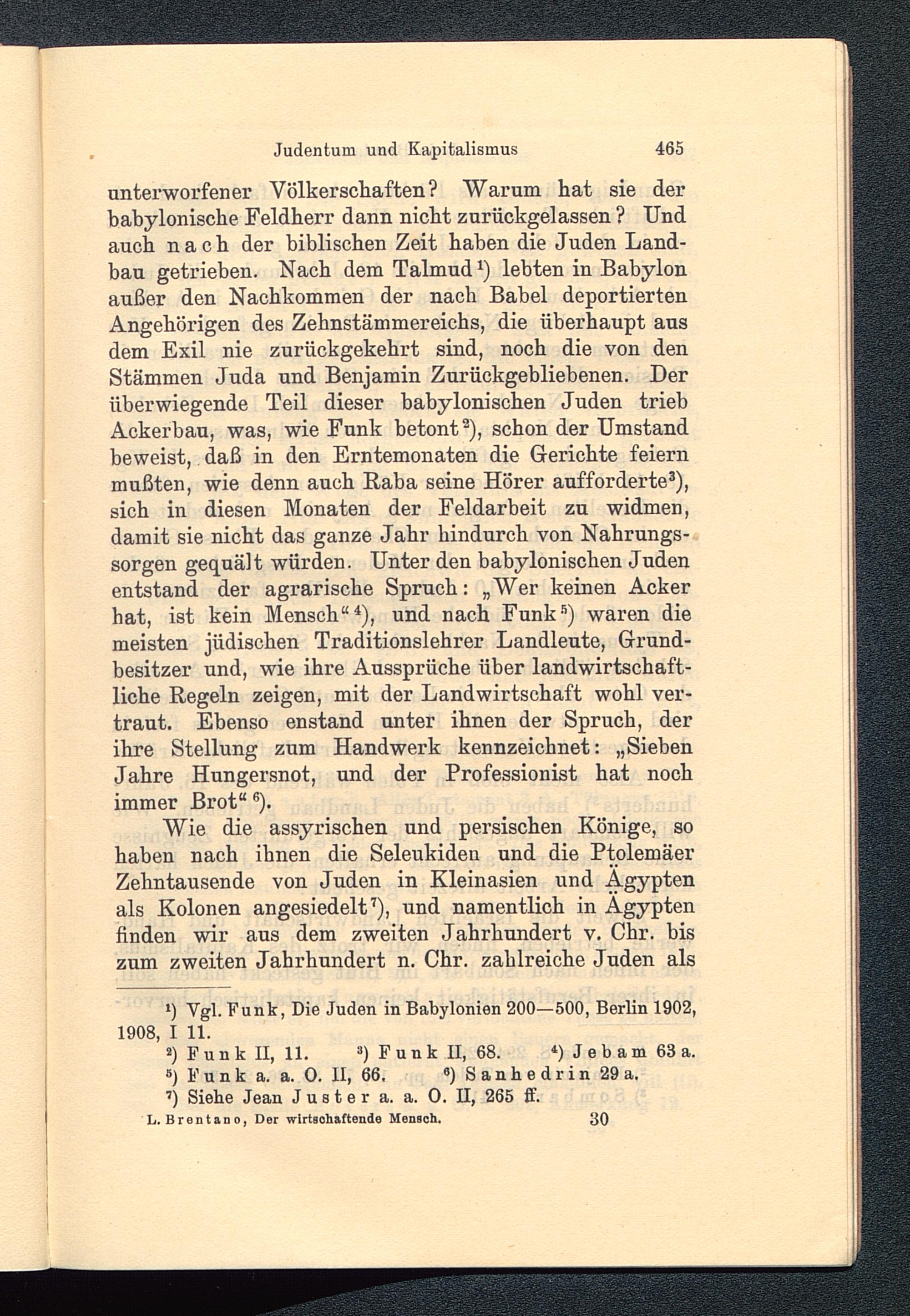 unterworfener Völkerschaften? Warum hat sie derbabylonische Feldherr dann nicht zurückgelassen ? Undauch nach der biblischen Zeit haben die Juden Land-bau getrieben. Nach dem Talmud * * 4 ) lebten in Babylon außer den Nachkommen der nach Babel deportiertenAngehörigen des Zehnstämmereichs, die überhaupt ausdem Exil nie zurückgekehrt sind, noch die von denStämmen Juda und Benjamin Zurückgebliebenen. Derüberwiegende Teil dieser babylonischen Juden triebAckerbau, was, wie Funk betont 2 ), schon der Umstandbeweist, daß in den Erntemonaten die Gerichte feiernmußten, wie denn auch Baba seine Hörer aufforderte 3 ),sich in diesen Monaten der Feldarbeit zu widmen,damit sie nicht das ganze Jahr hindurch von Nahrungs-sorgen gequält würden. Unter den babylonischen Judenentstand der agrarische Spruch: „Wer keinen Ackerhat, ist kein Mensch“ 4 ), und nach Funk 5 ) waren diemeisten jüdischen Traditionslehrer Landleute, Grund-besitzer und, wie ihre Aussprüche über landwirtschaft-liche Regeln zeigen, mit der Landwirtschaft wohl ver-traut. Ebenso enstand unter ihnen der Spruch, derihre Stellung zum Handwerk kennzeichnet: „SiebenJahre Hungersnot, und der Professionist hat nochimmer Brot“ 6 ).