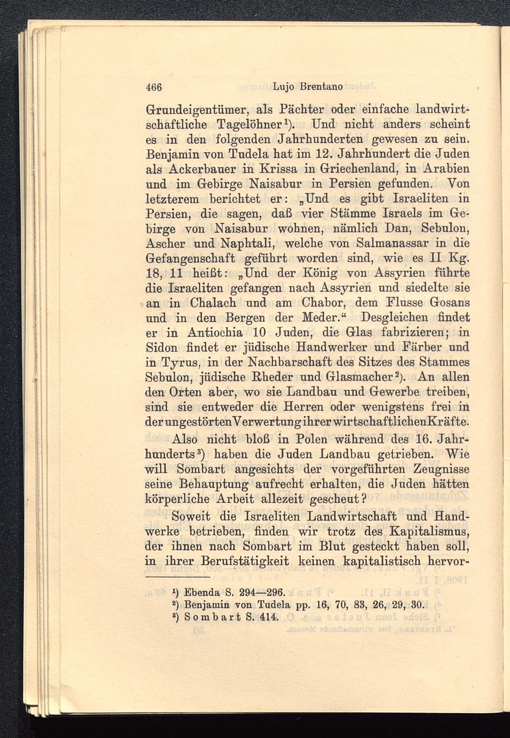 Grundeigentümer, als Pächter oder einfache landwirt-schaftliche Tagelöhner 1 ). Und nicht anders scheintes in den folgenden Jahrhunderten gewesen zu sein.Benjamin von Tudela hat im 12. Jahrhundert die Judenals Ackerbauer in Krissa in Griechenland, in Arabien und im Gebirge Naisabur in Persien gefunden. Vonletzterem berichtet er: „Und es gibt Israeliten inPersien , die sagen, daß vier Stämme Israels im Ge-birge von Naisabur wohnen, nämlich Dan, Sebulon ,Ascher und Naphtali , welche von Salmanassar in dieGefangenschaft geführt worden sind, wie es II Kg.18, 11 heißt: „Und der König von Assyrien führtedie Israeliten gefangen nach Assyrien und siedelte siean in Chalach und am Chabor, dem Flusse Gosansund in den Bergen der Meder.“ Desgleichen findeter in Antiochia 10 Juden, die Glas fabrizieren; inSidon findet er jüdische Handwerker und Färber undin Tyrus , in der Nachbarschaft des Sitzes des StammesSebulon , jüdische Rheder und Glasmacher 2 ). An allenden Orten aber, wo sie Landbau und Gewerbe treiben,sind sie entweder die Herren oder wenigstens frei inderungestörtenYerwertungihrerwirtschaftlichenKräfte.