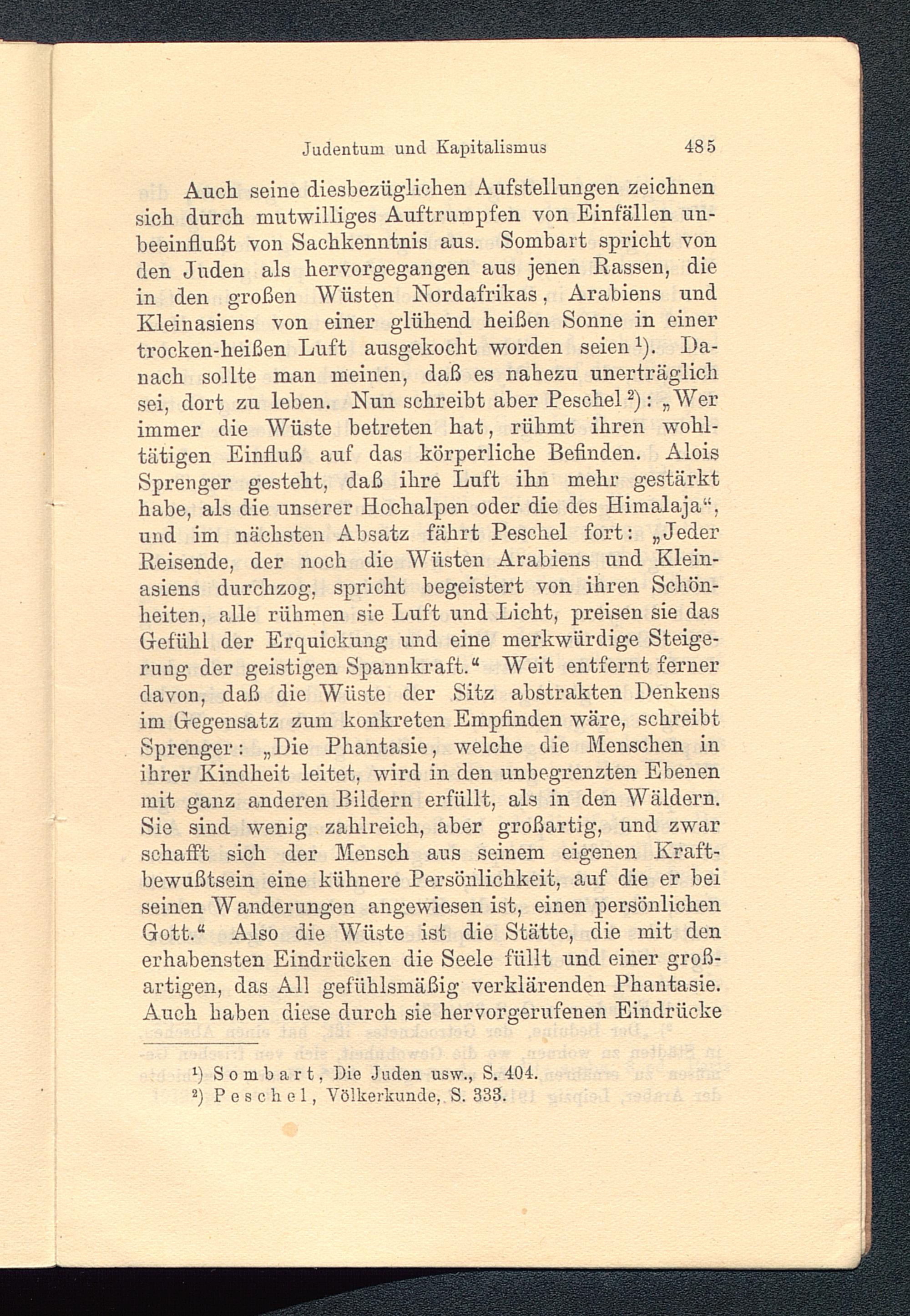 Auch seine diesbezüglichen Aufstellungen zeichnensich durch mutwilliges Auftrumpfen von Einfällen un-beeinflußt von Sachkenntnis aus. Sombart spricht vonden Juden als hervorgegangen aus jenen Rassen, diein den großen Wüsten Nordafrikas . Arabiens undKleinasiens von einer glühend heißen Sonne in einertrocken-heißen Luft ausgekocht worden seien 1 ). Da-nach sollte man meinen, daß es nahezu unerträglichsei, dort zu leben. Nun schreibt aber Peschei 2 ): „Werimmer die Wüste betreten hat, rühmt ihren wohl-tätigen Einfluß auf das körperliche Befinden. AloisSprenger gesteht, daß ihre Luft ihn mehr gestärkthabe, als die unserer Hochalpen oder die des Himalaja “,und im nächsten Absatz fährt Peschei fort: „JederReisende, der noch die Wüsten Arabiens und Klein-asiens durchzog, spricht begeistert von ihren Schön-heiten, alle rühmen sie Luft und Licht, preisen sie dasGefühl der Erquickung und eine merkwürdige Steige-rung der geistigen Spannkraft.“ Weit entfernt fernerdavon, daß die Wüste der Sitz abstrakten Denkensim Gegensatz zum konkreten Empfinden wäre, schreibtSprenger: „Die Phantasie, welche die Menschen inihrer Kindheit leitet, wird in den unbegrenzten Ebenenmit ganz anderen Bildern erfüllt, als in den Wäldern.Sie sind wenig zahlreich, aber großartig, und zwarschafft sich der Mensch aus seinem eigenen Kraft-bewußtsein eine kühnere Persönlichkeit, auf die er beiseinen Wanderungen angewiesen ist, einen persönlichenGott.“ Also die Wüste ist die Stätte, die mit denerhabensten Eindrücken die Seele füllt und einer groß-artigen, das All gefühlsmäßig verklärenden Phantasie.Auch haben diese durch sie hervorgerufenen Eindrücke