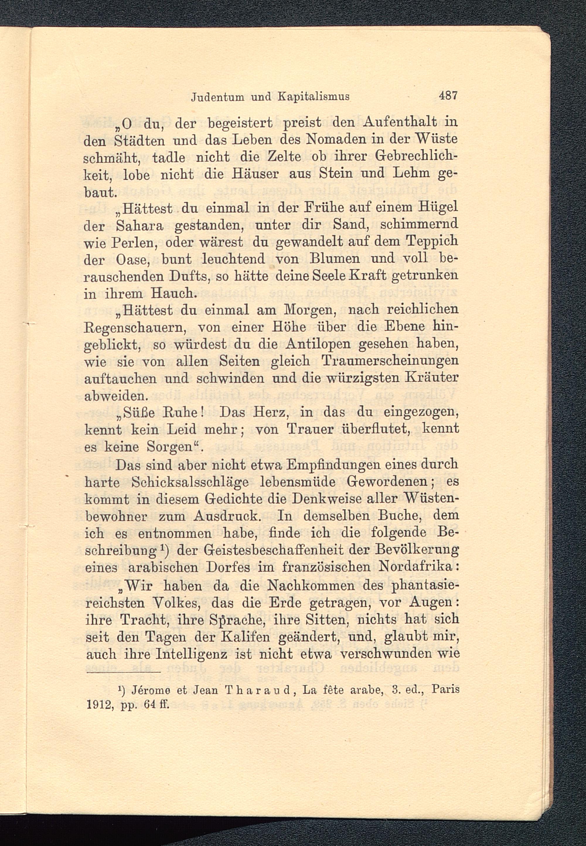 Das sind aber nicht etwa Empfindungen eines durchharte Schicksalsschläge lebensmüde Gewordenen; eskommt in diesem Gedichte die Denkweise aller Wüsten-bewohner zum Ausdruck. In demselben Buche, demich es entnommen habe, finde ich die folgende Be-schreibung x ) der Geistesbeschaffenheit der Bevölkerungeines arabischen Dorfes im französischen Nordafrika :